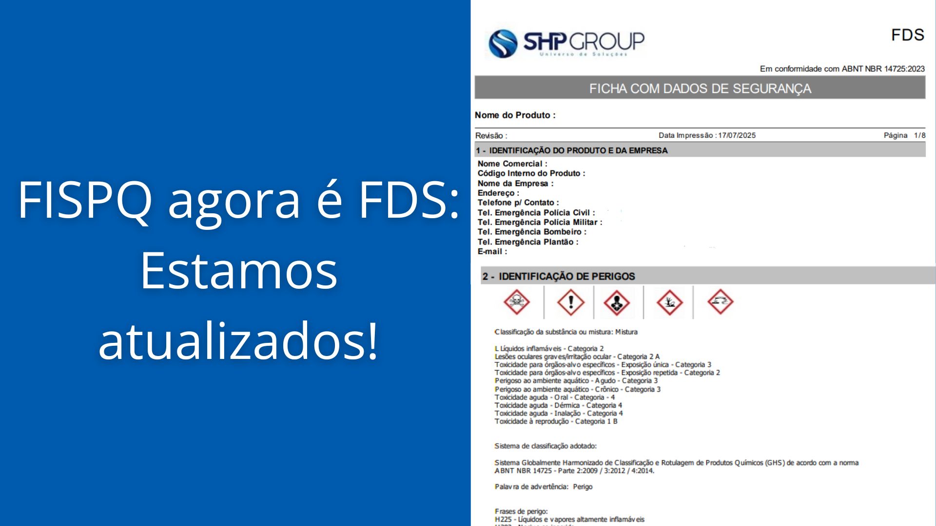 A partir de 01/07/2025, a FISPQ (Ficha de Informações de Segurança de Produtos Químicos) passou a se chamar FDS – Ficha com Dados de Segurança, conforme nova norma ABNT NBR 14725.