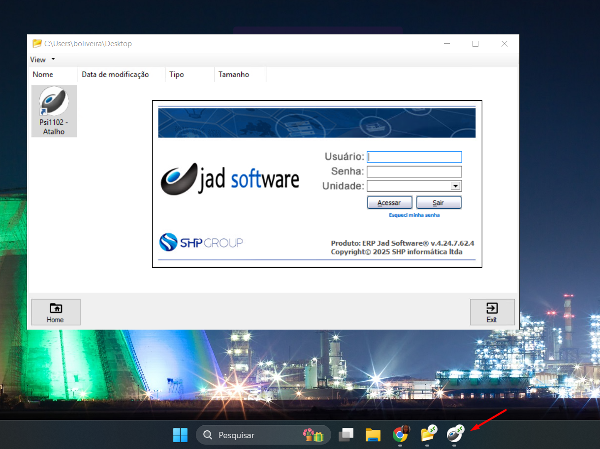 Com um duplo clique sobre o ícone, a tela de login do sistema JAD será exibida. Note que, na barra de tarefas (no rodapé) se encontra o ícone do sistema JAD, permitindo assim transitar entre os programas de fácil acesso.