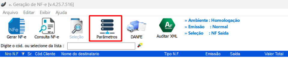 No módulo de Geração de NF-e, em parâmetros