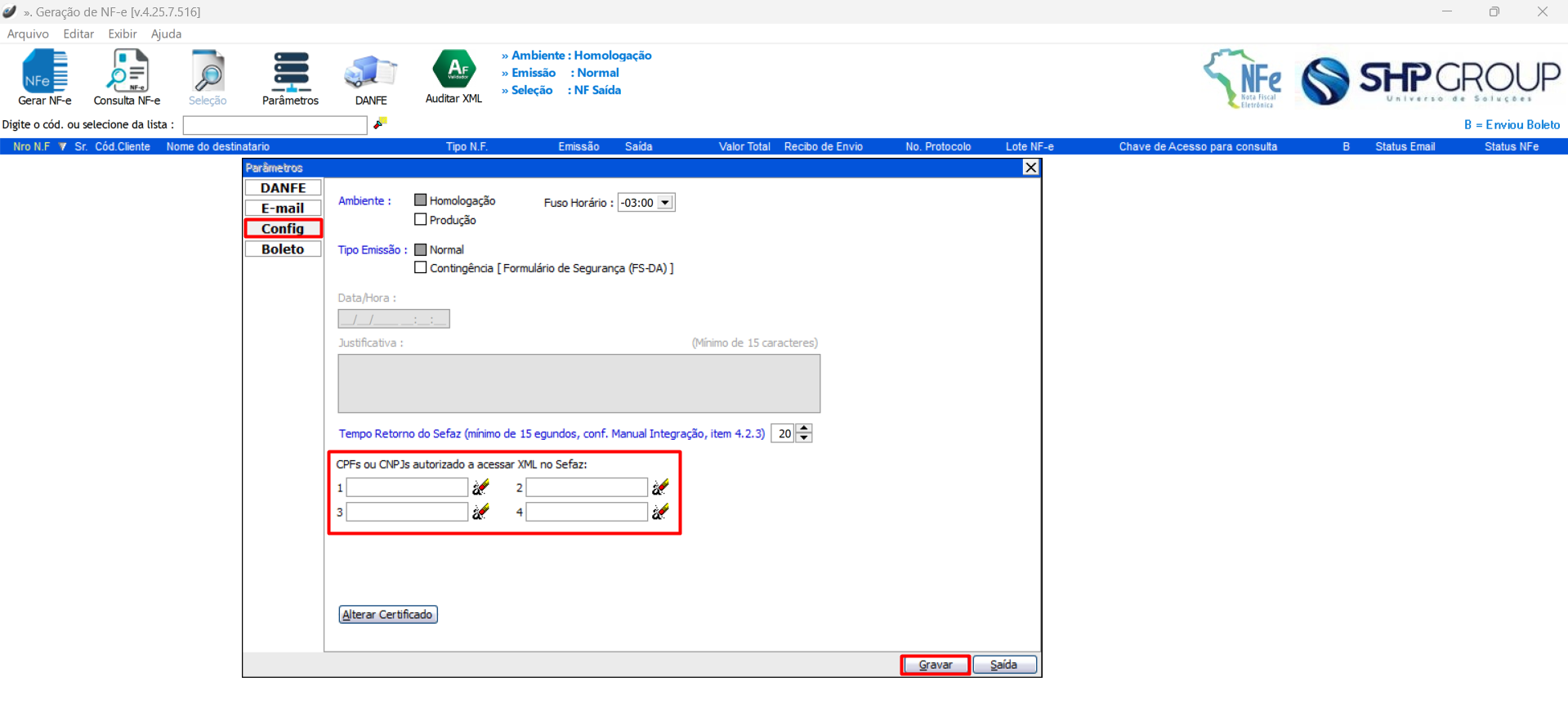 Na ficha "Config" preencha o CPF ou CNPJ em um dos campos em destaque para autorizar o acesso ao XML no SEFAZ Ao finalizar, clique em "Gravar"