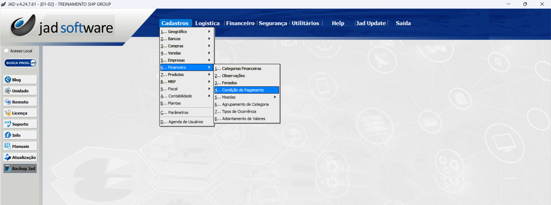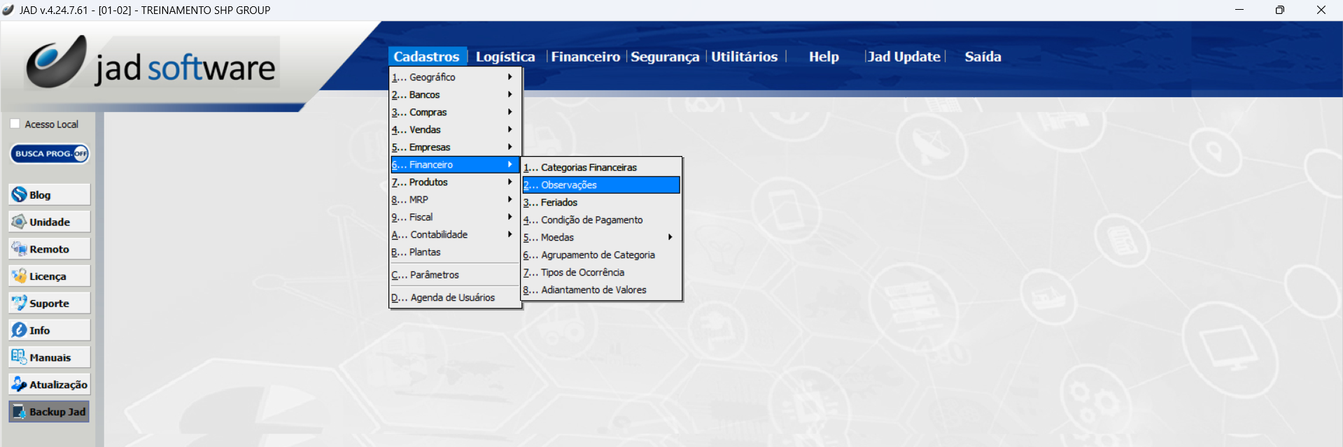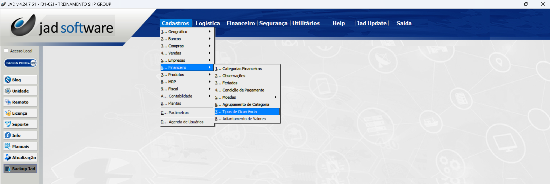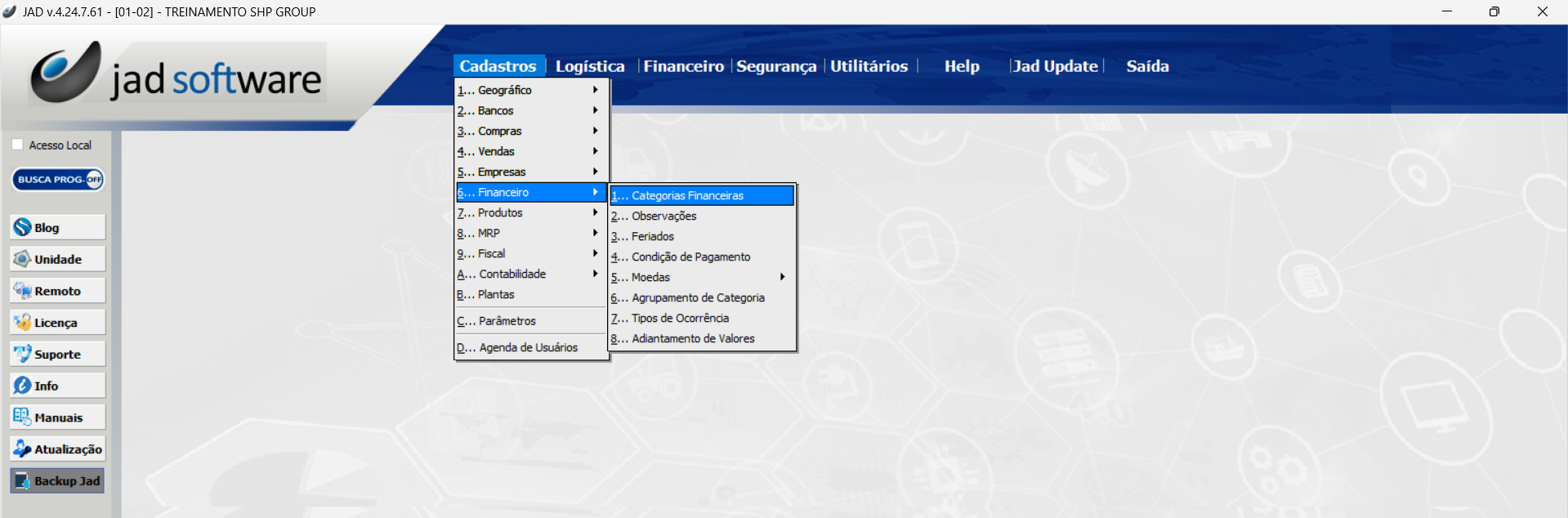 Para acessar a módulo de Cadastro de Categorias Financeiras, siga a rota: