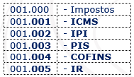 O número 001 é o subgrupo “ICMS”, o número 002 é o subgrupo “IPI” e assim por diante. Este critério é repetido para todos os subgrupos do grupo IMPOSTO.