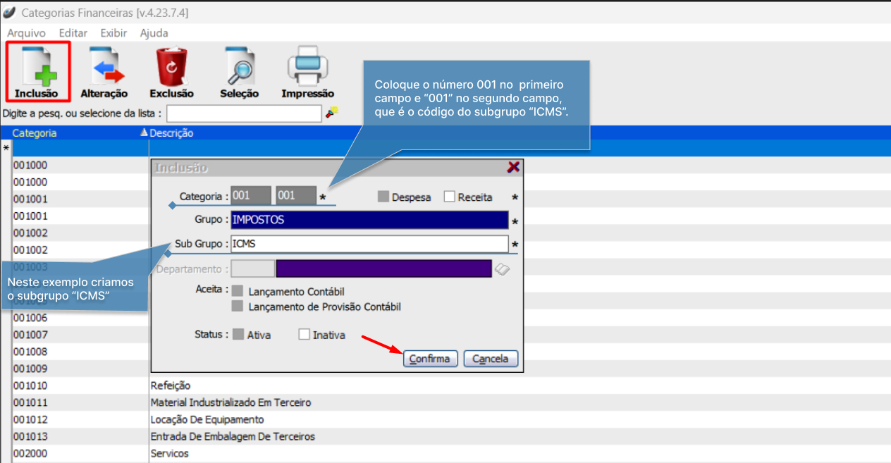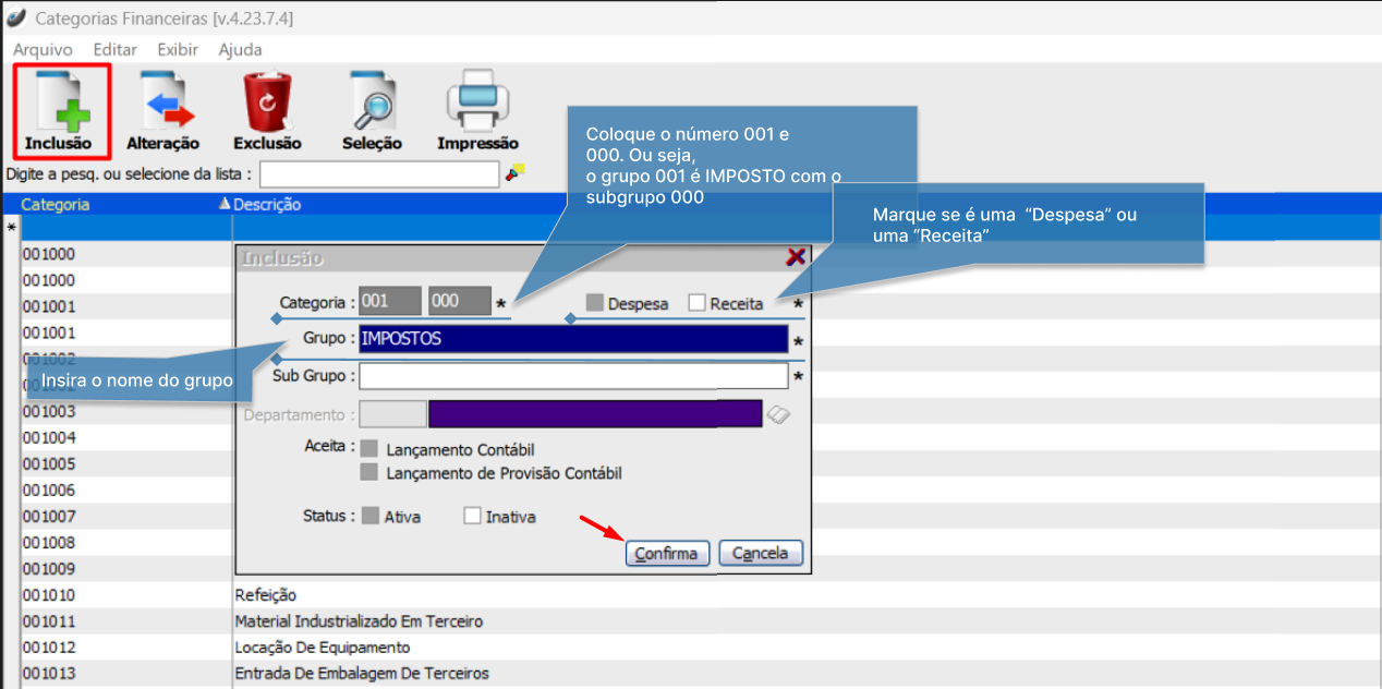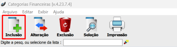 Agora, tendo cadastrado o grupo Imposto, poderá cadastrar os subgrupos clicando novamente no botão “Inclusão”.