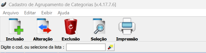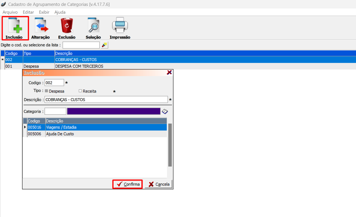 "Inclusão"Preencha os campos obrigatórios, clique no livrinho para inserir as categorias que deseja agrupar e clique no botão “Confirma”