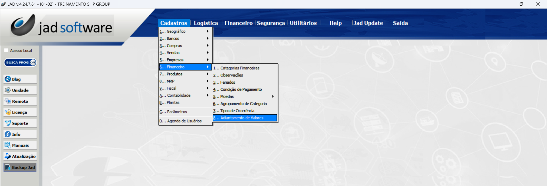 Para acessar a módulo, siga a rota: Cadastros > Financeiro > Adiantamento de ValoresEm todos os módulos do sistema Jad, temos os botões de ação: