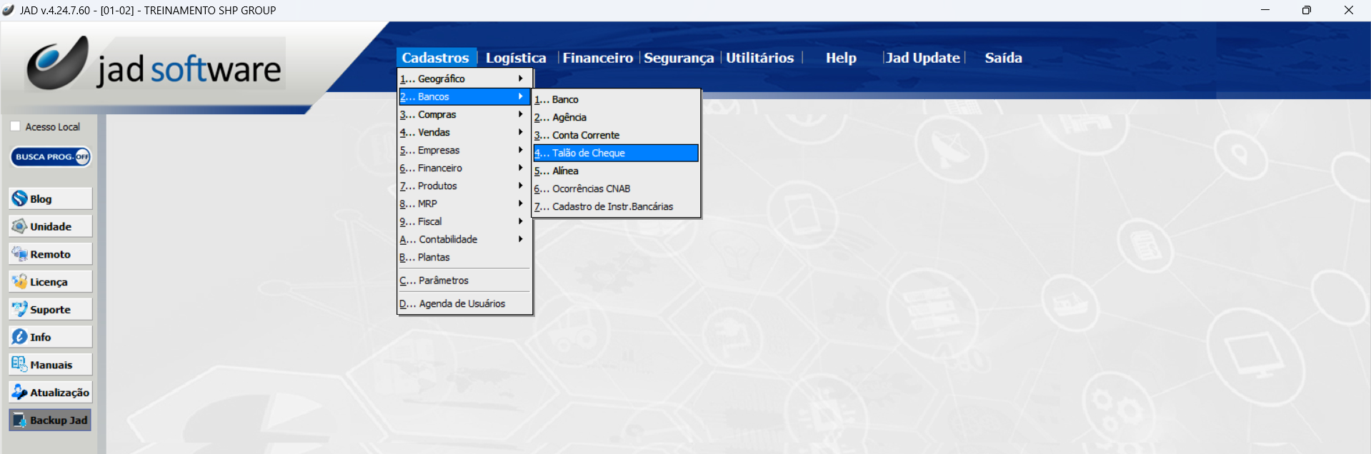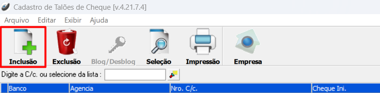 Cadastros > Bancos > Talão de Cheque