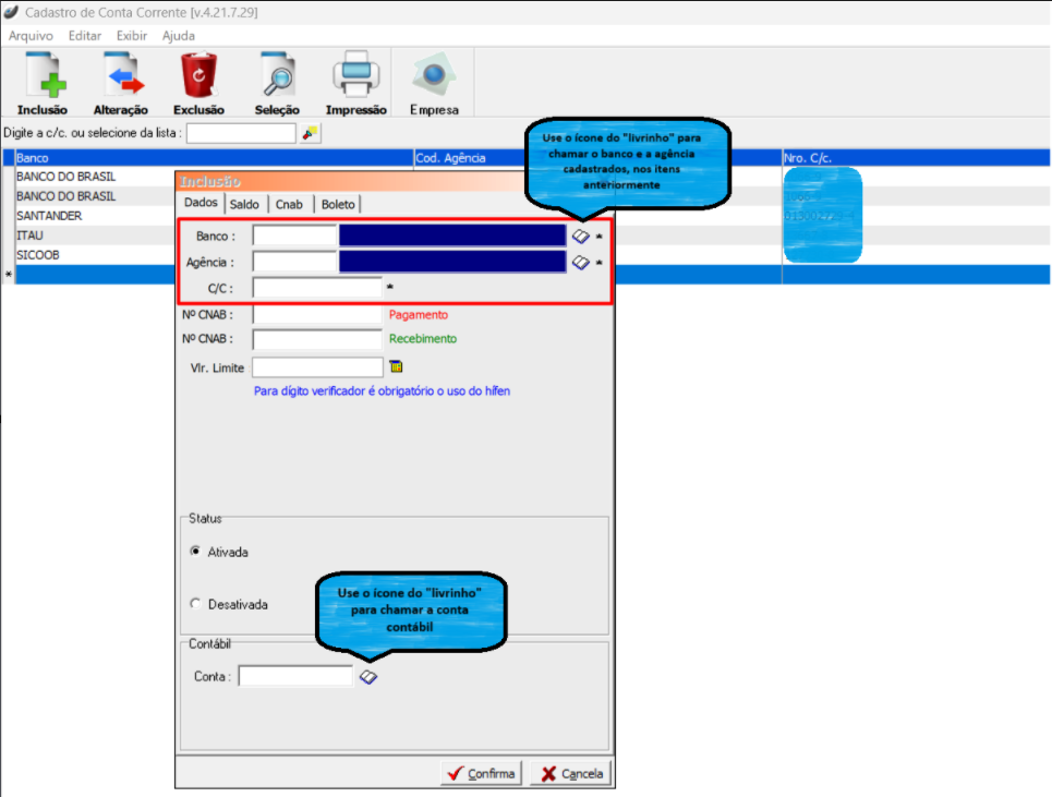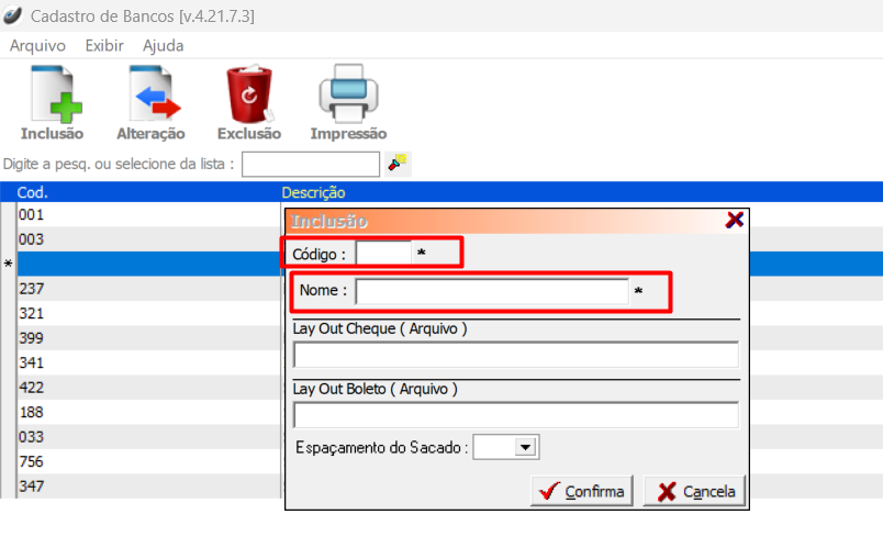 Preencha os campos necessários, como número e nome do banco, ao fim clique em "Confirma"