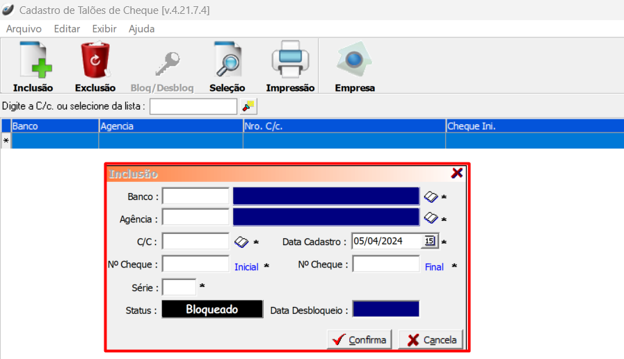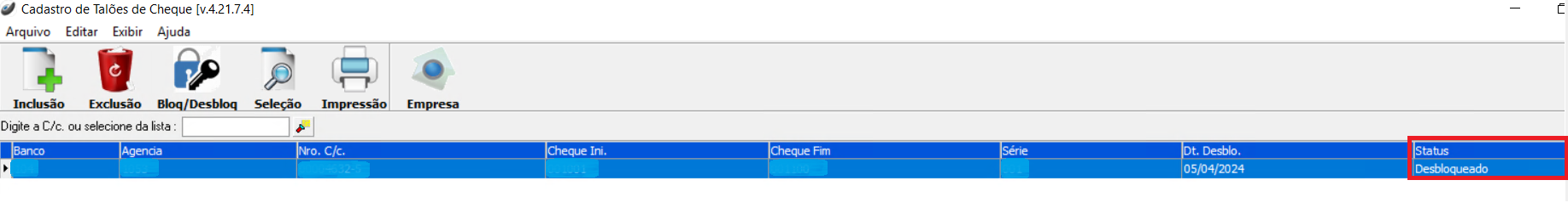 Ao cadastrar um novo talão, o seu status iniciará como "Bloqueado" Para efetuar o desbloqueio de um talão de cheques, selecione o registro que deseja fazer a