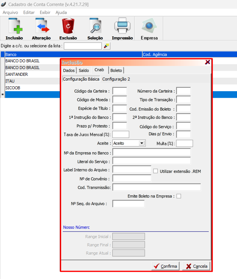 Na aba "CNAB" As informações que devem ser inseridas nesta aba, são fornecidas pelo banco referente a conta corrente cadastrada, ao finalizar clique em "Confirma" e seguiremos para a próxima aba.