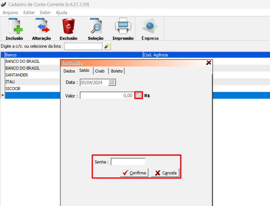 Na aba "Saldo" Deverá inserir o valor de saldo inicial, clique no ícone da calculadora e digite a senha , ao finalizar clique em "Confirma".