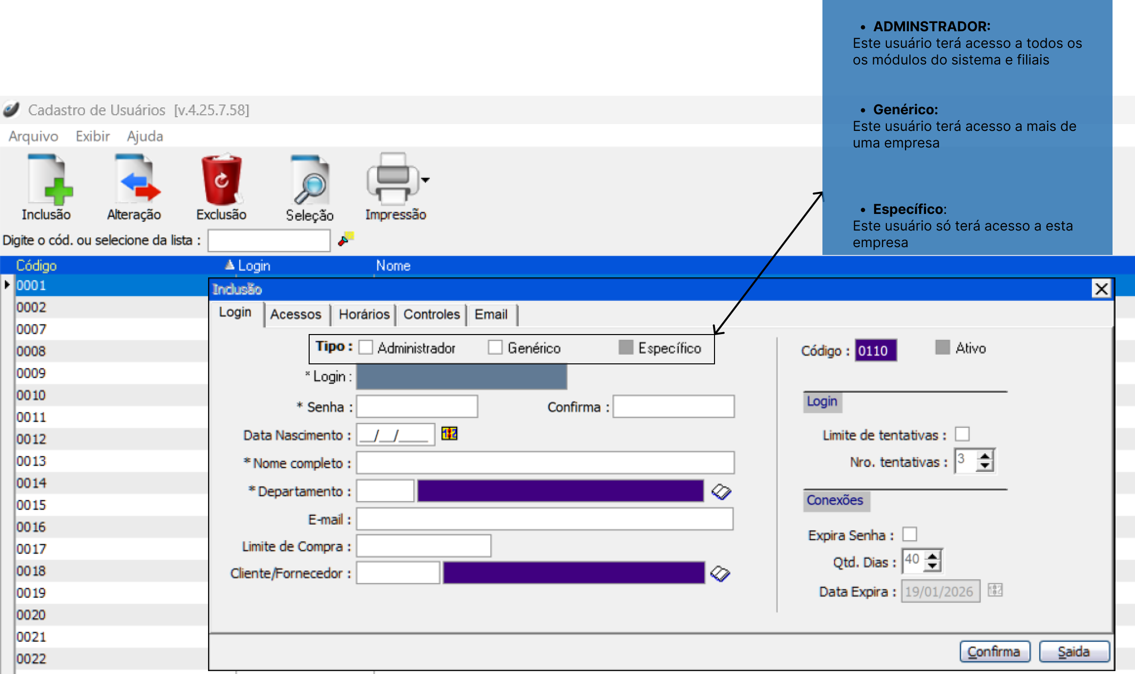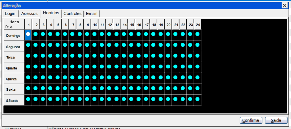 Horários" é definido o dia em que aquele usuário poderá acessar ao sistema, assim como o horário.