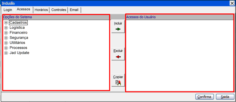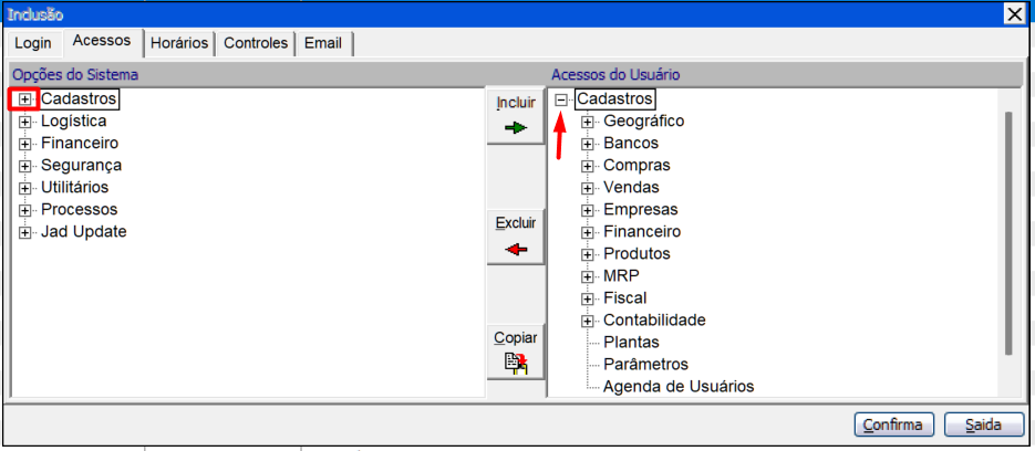 Incluir" um módulo ao campo direito (Acessos do Usuário), logo este colaborador terá permissão para visualizar o módulo "Cadastros" no Menu Inicial do Jad assim como abrir os demais módulos atrelados a este menu.