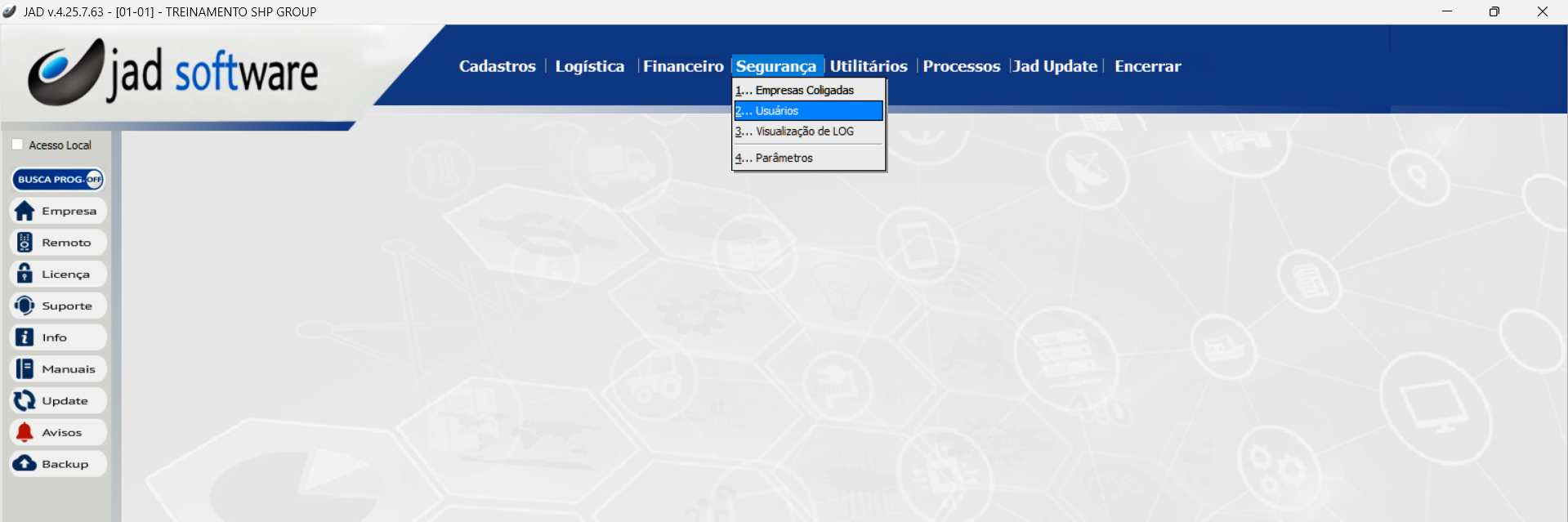 Neste exemplo, temos o Cadastro Geográfico / Cadastro de Bancos / Cadastro de Compras / Cadastro de Vendas e assim por diante.