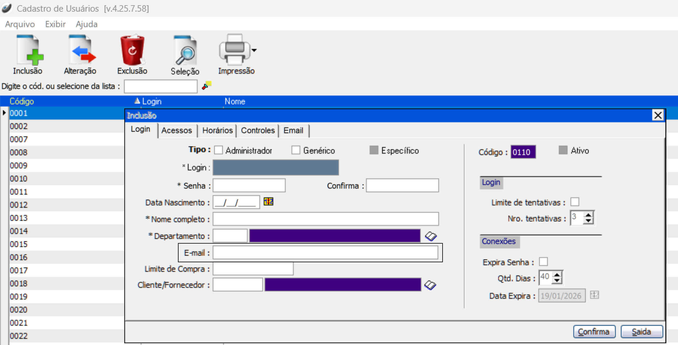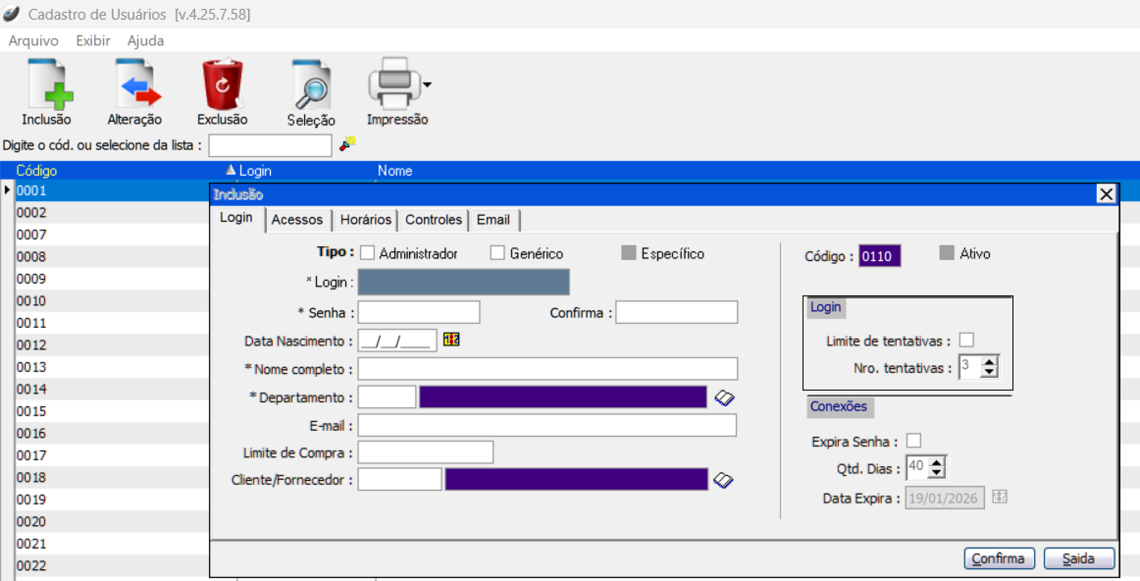 Caso queira bloquear o usuário por tentativas de acesso, basta acionar essa caixa de seleção e definir o número de tentativas que o usuário poderá acessar, ultrapassando esse limite o usuário será bloqueado.