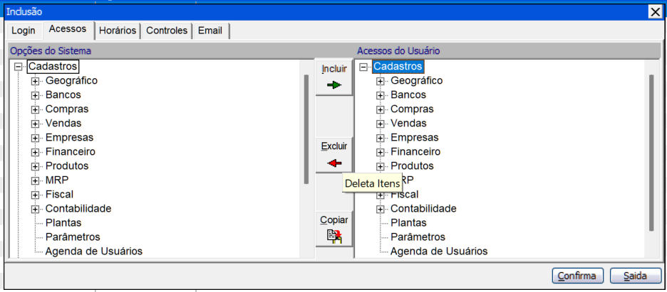 Com um duplo clique sobre o módulo em Acessos do usuário, é possível limitar o acesso a estes botões, basta desmarcar a caixa de seleção da seguinte forma: