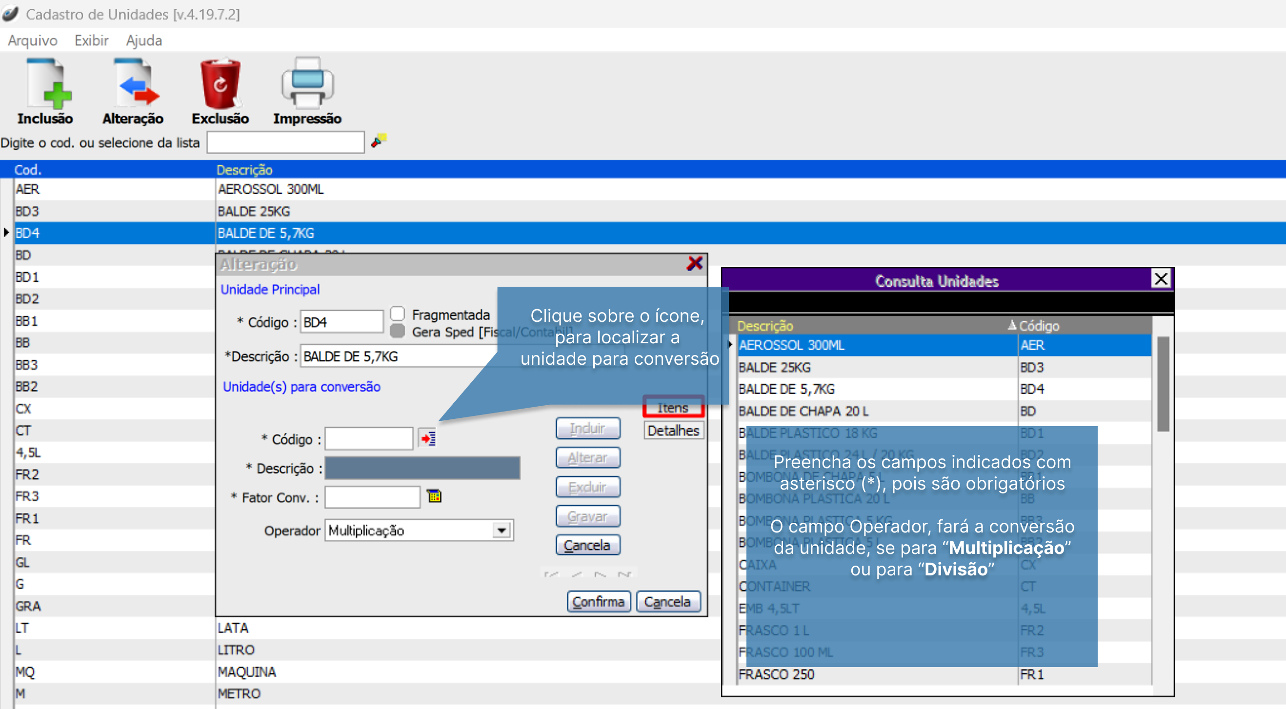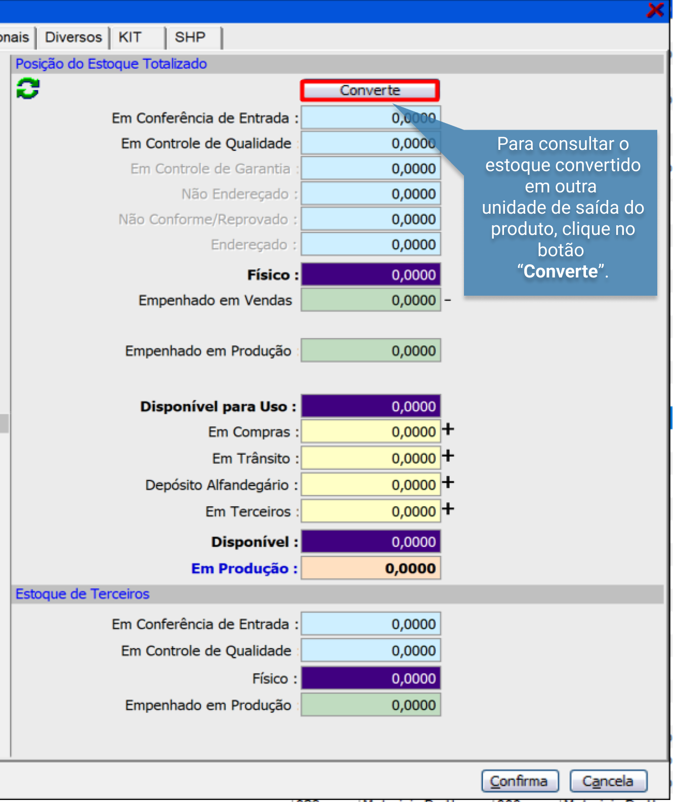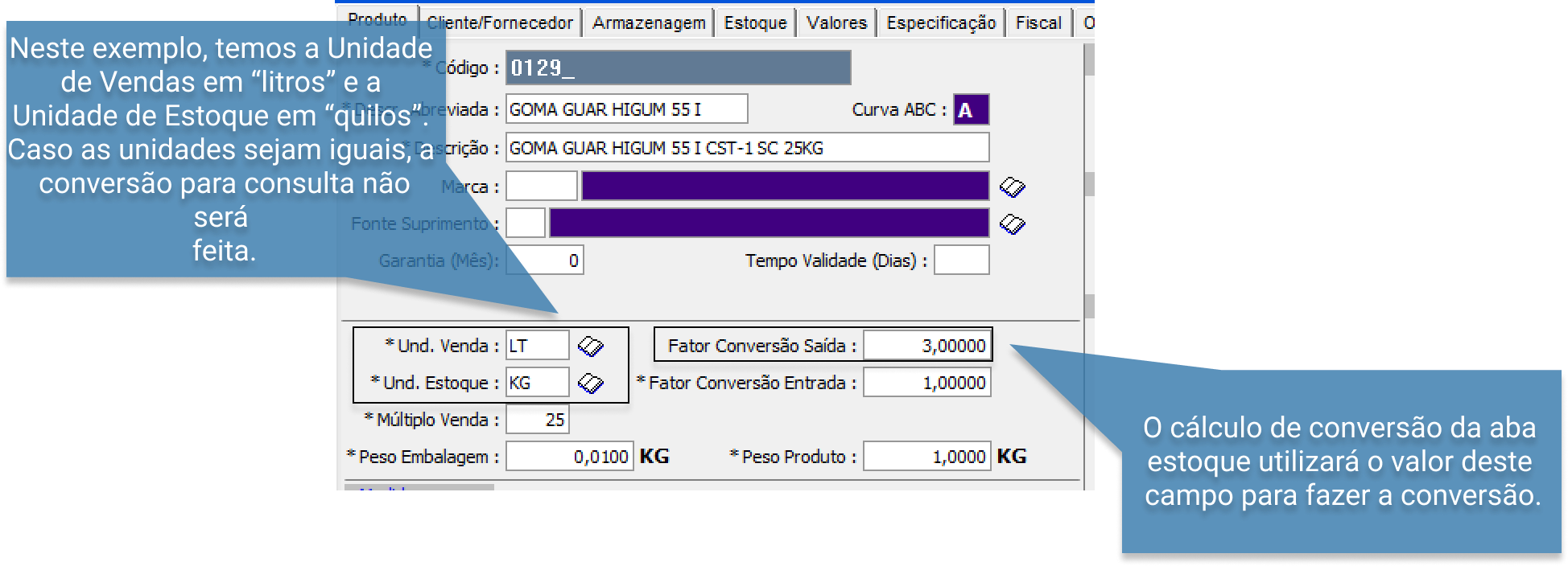 Para fazer a consulta do estoque com a conversão de unidade, (botão "Converte" temos que verificar se na aba “Produto” do Cadastro de Produtos, as informações estão gravadas corretamente.