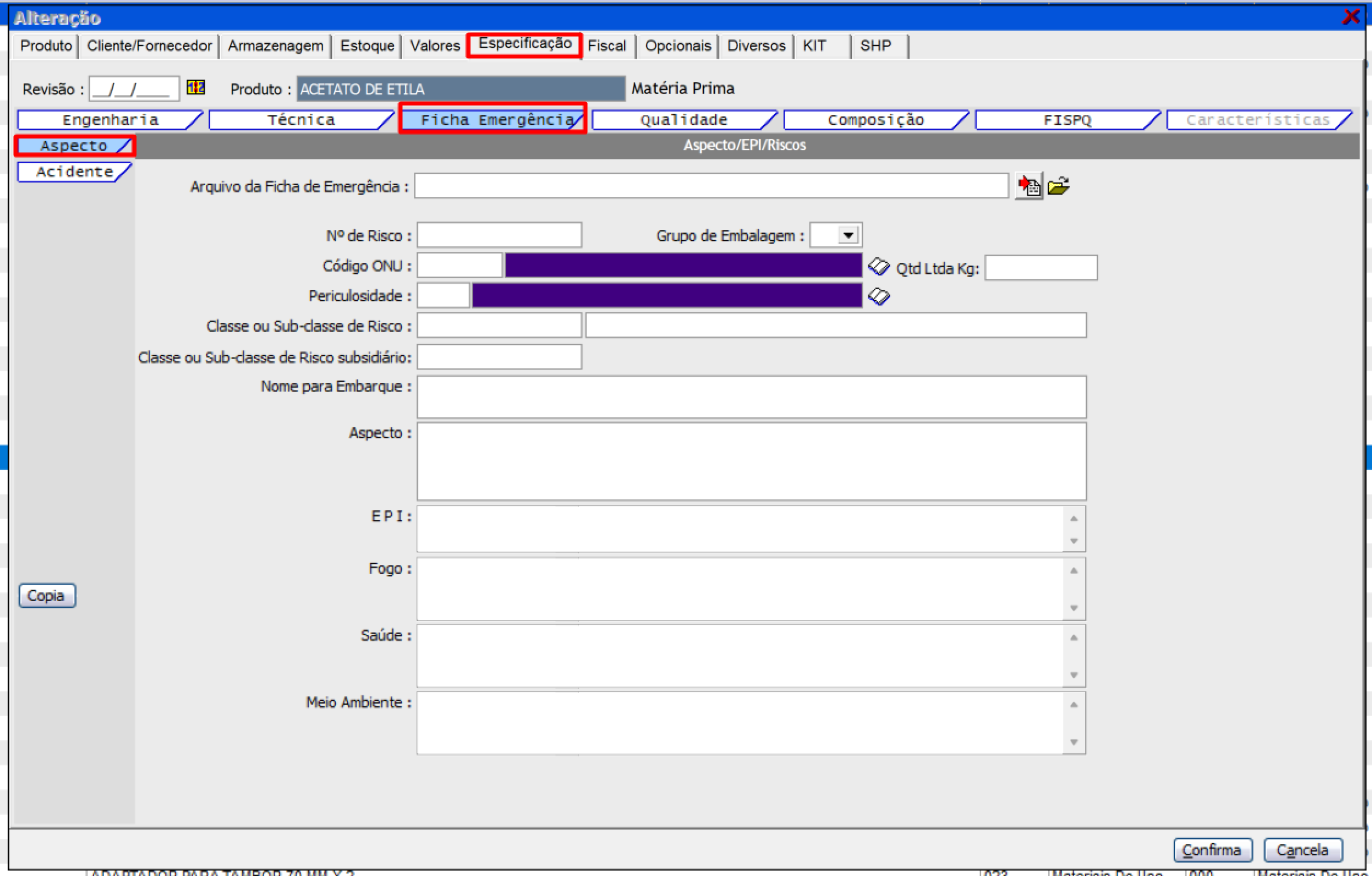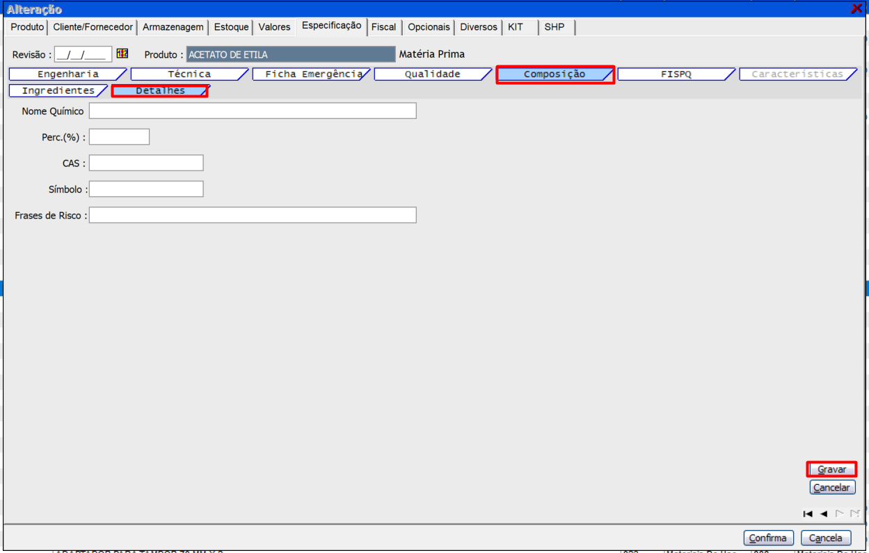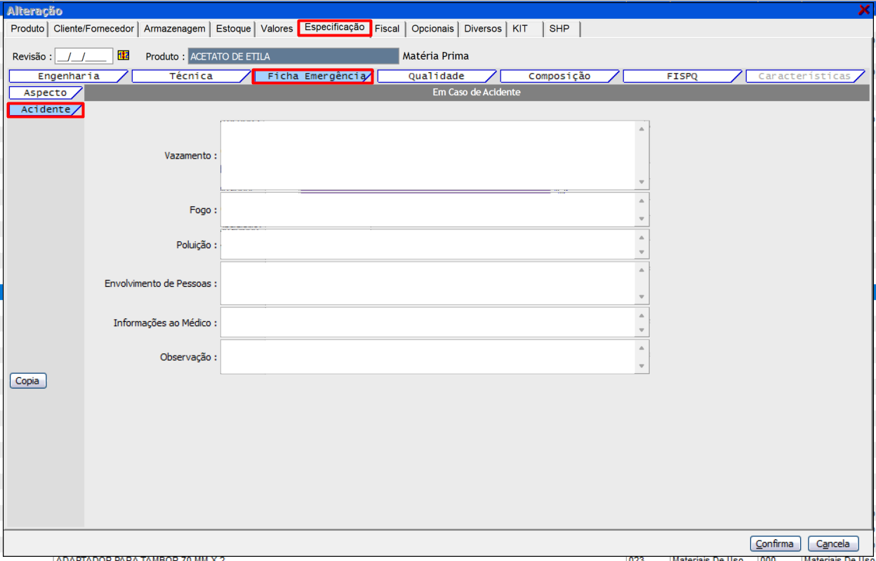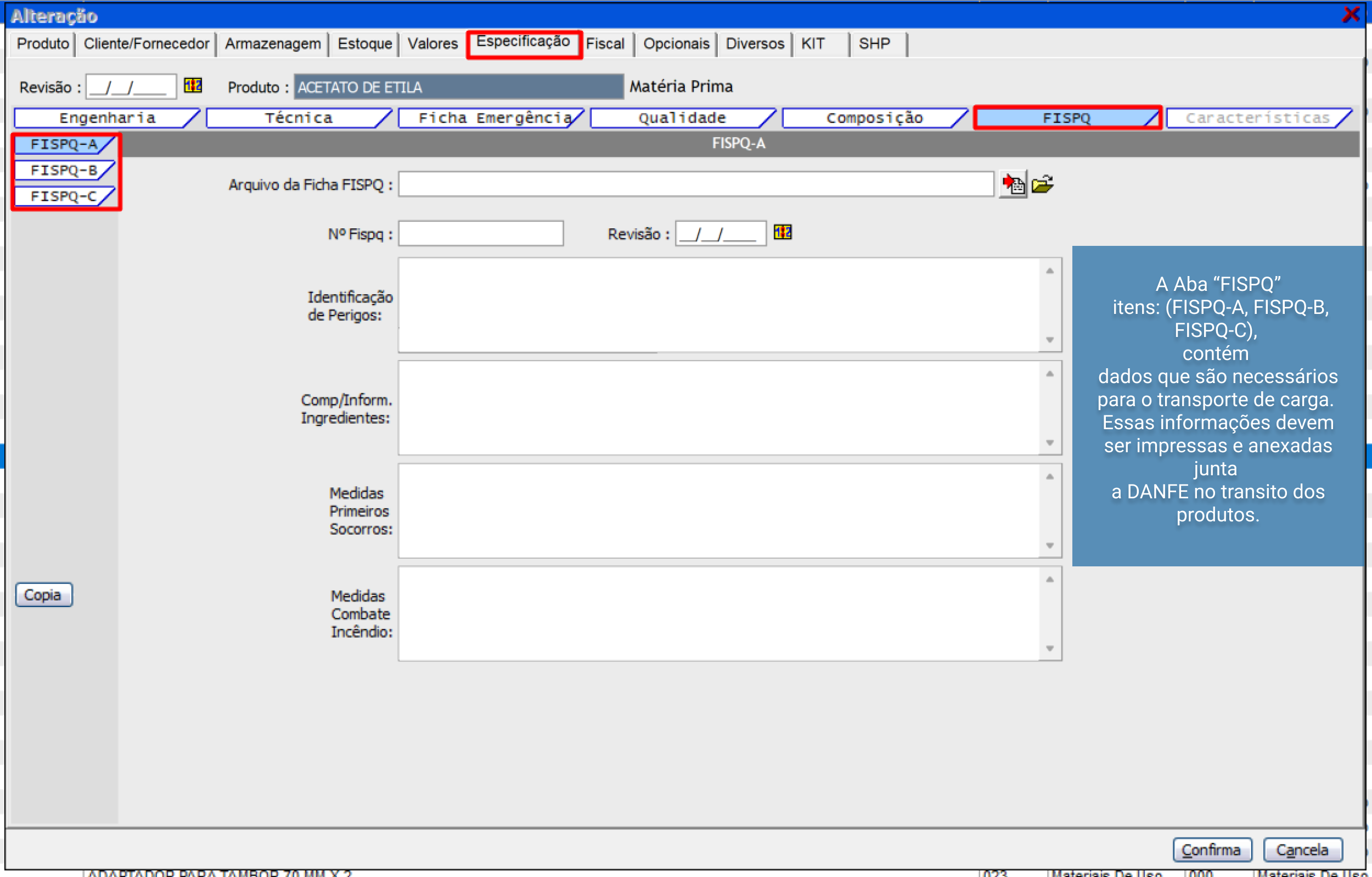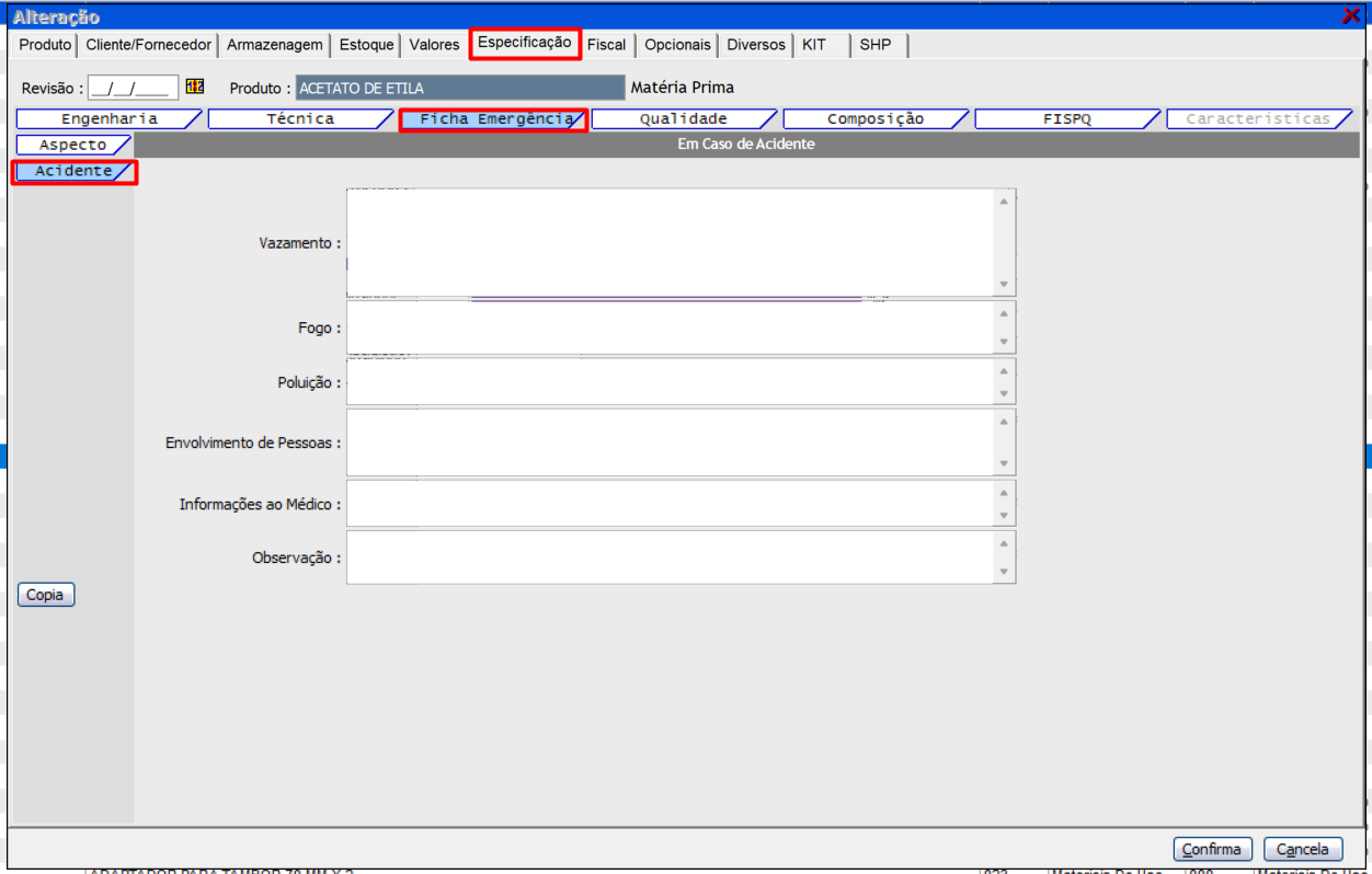 Última aba "FISPQ" da ficha "Especificações"