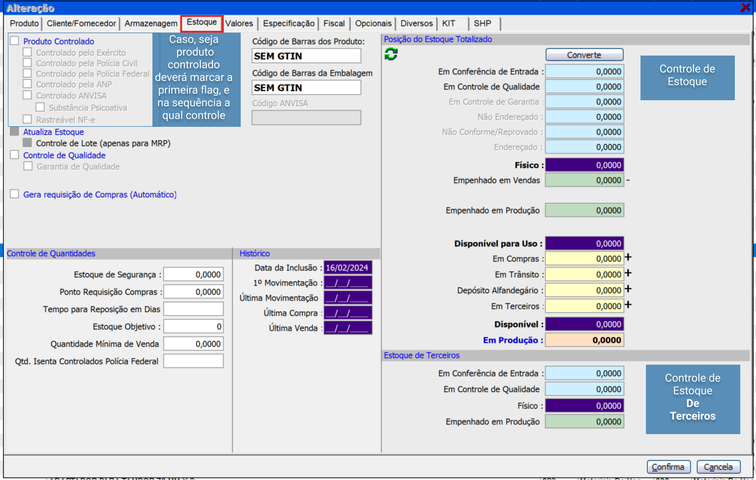 Na sequência, a aba "Estoque". Não há campos obrigatórios a serem preenchidos