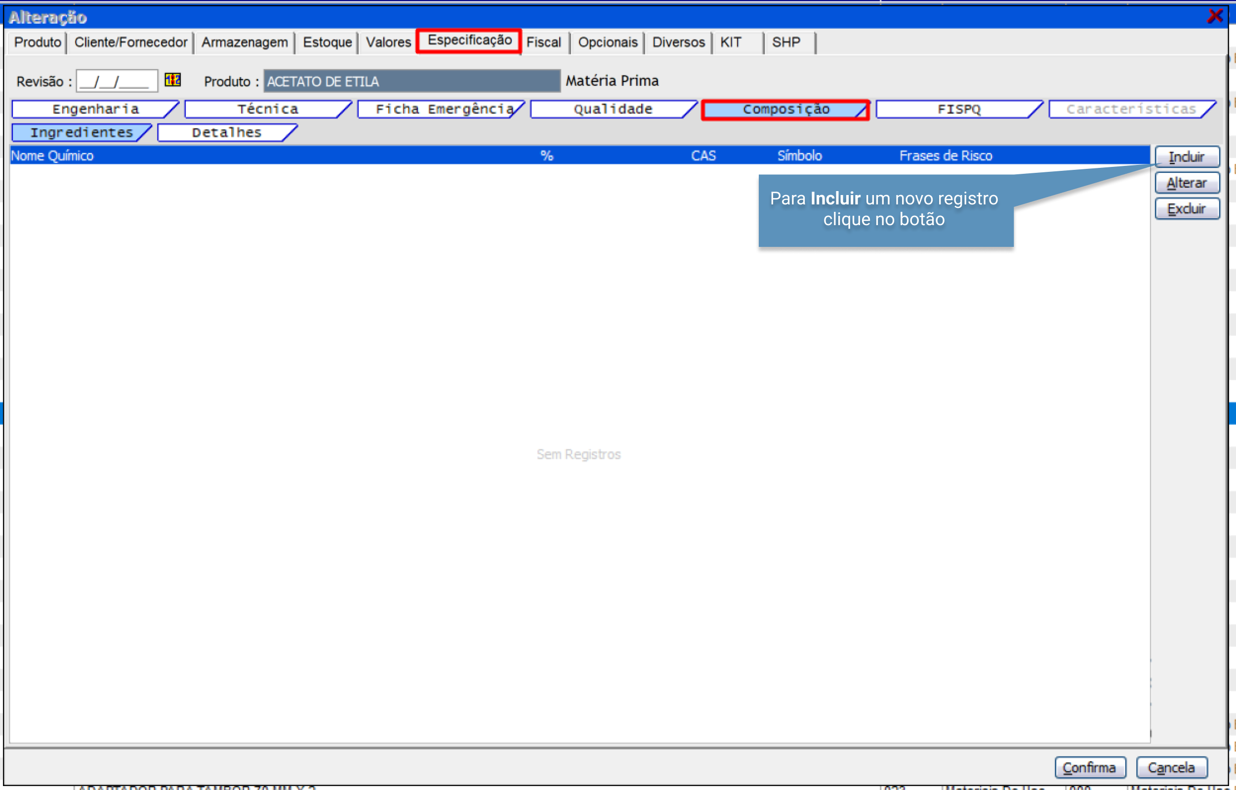 na aba "Composição" basta inserir as informações pertinentes a composição do produto e clicando no botão “Incluir”.