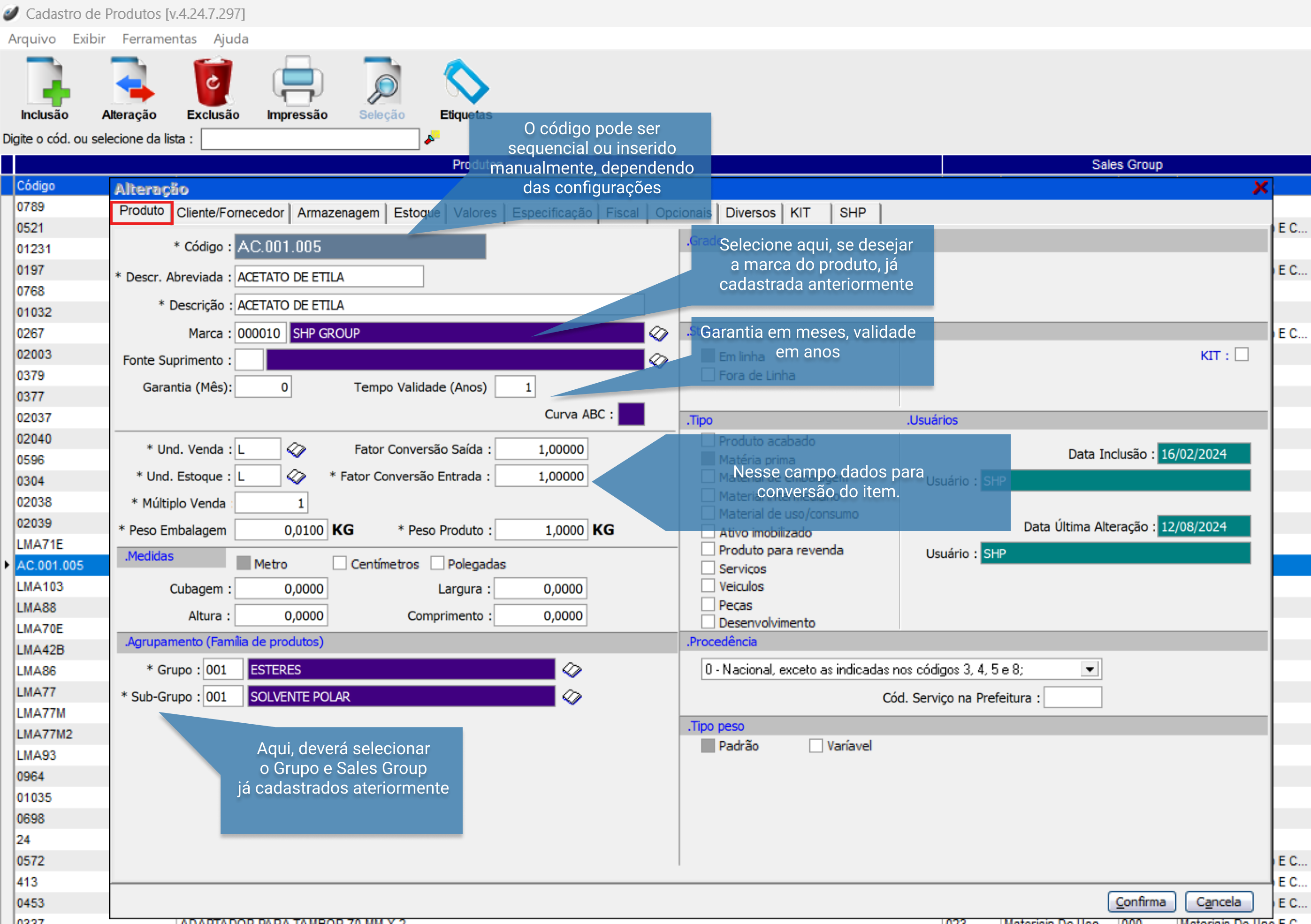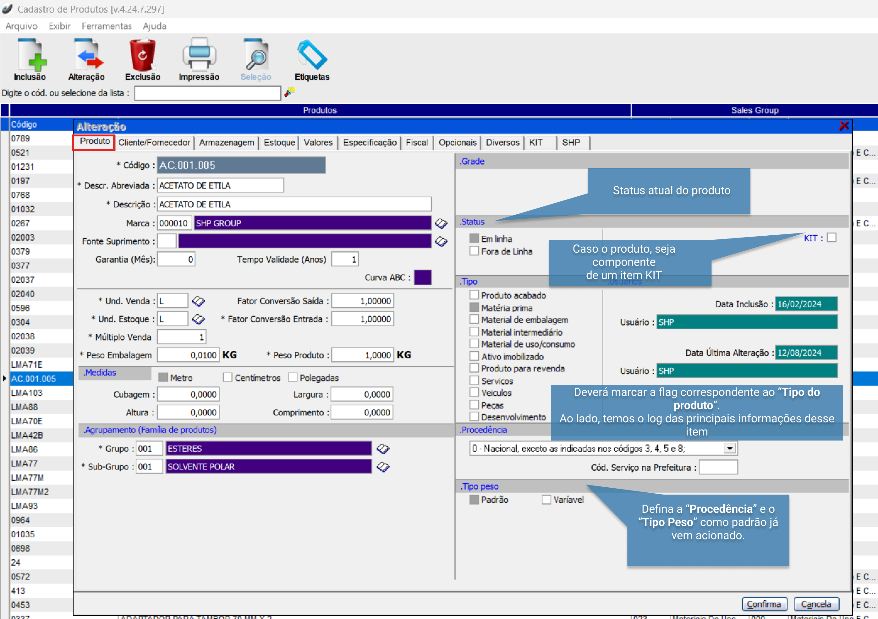 - Unidade de Medida: Definição da unidade de medida padrão (como quilos, metros, litros) para controle de estoque e movimentação.