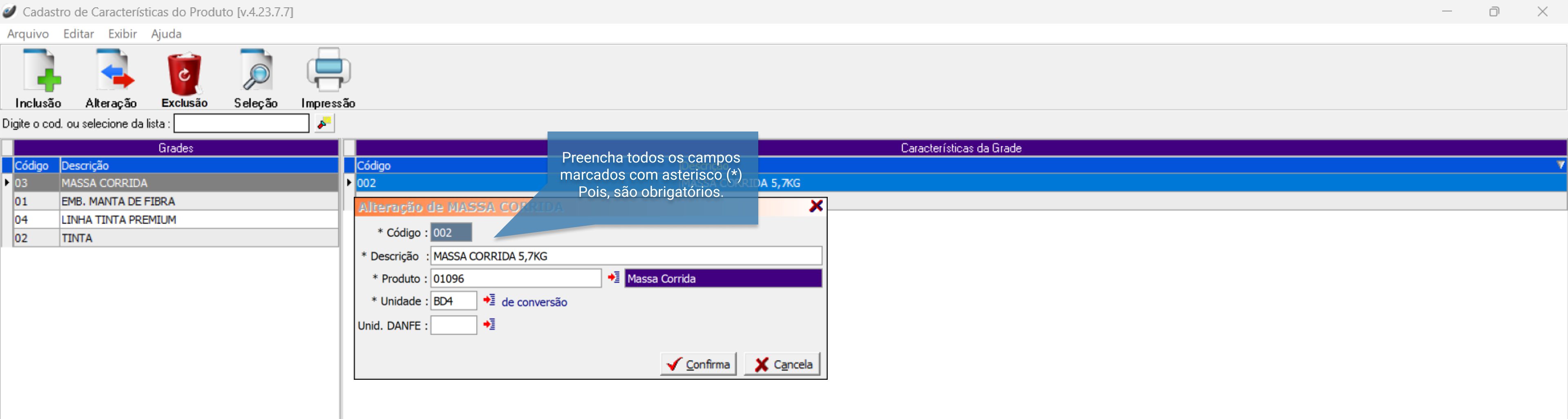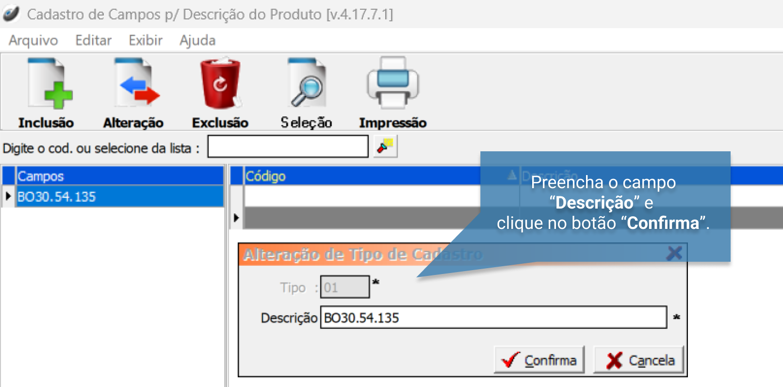 Descrição" conforme padronização, estes são campos obrigatórios (*).