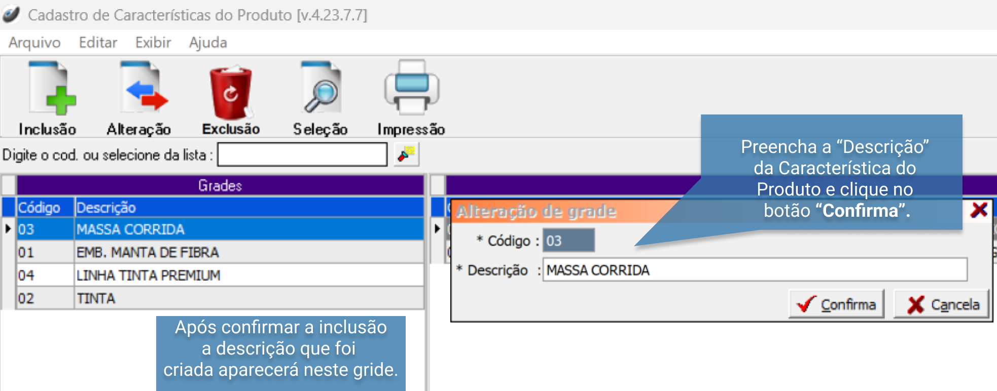 No campo "Descrição" deverá indicar o nome da grade do produto;