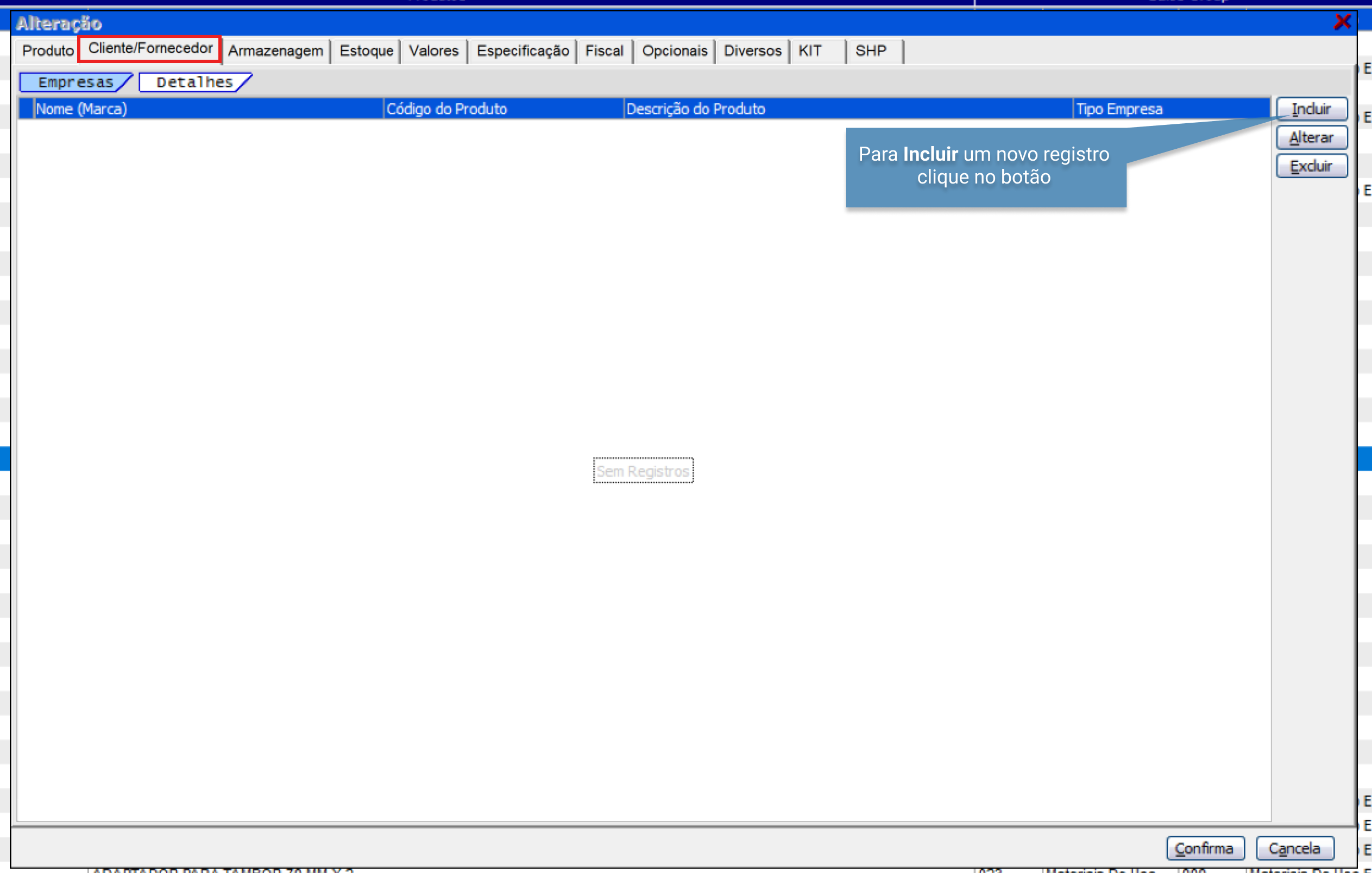Para vender a um cliente ou comprar de um fornecedor um produto que precisa ter outro código e descrição, clique no botão “Incluir” para inserir as informações: