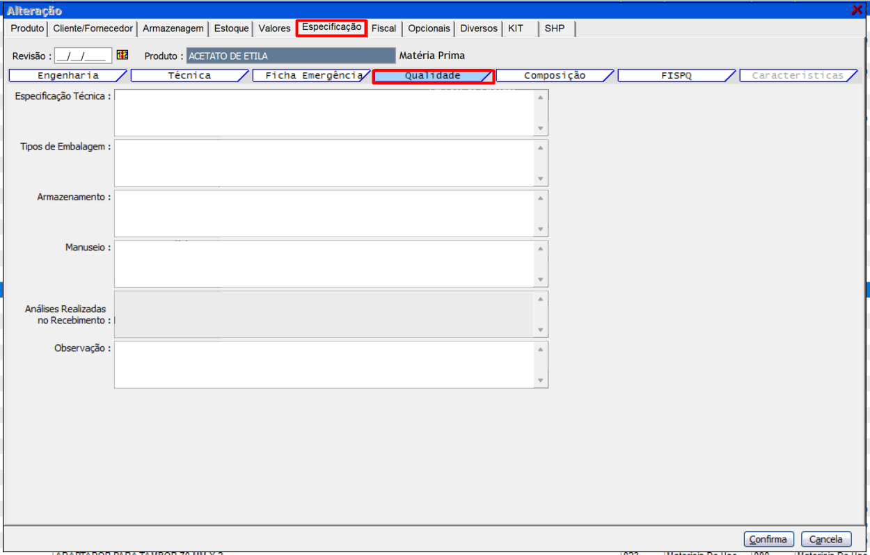 Ainda na ficha "Especificação" seguimos para a seguinte aba "Qualidade"