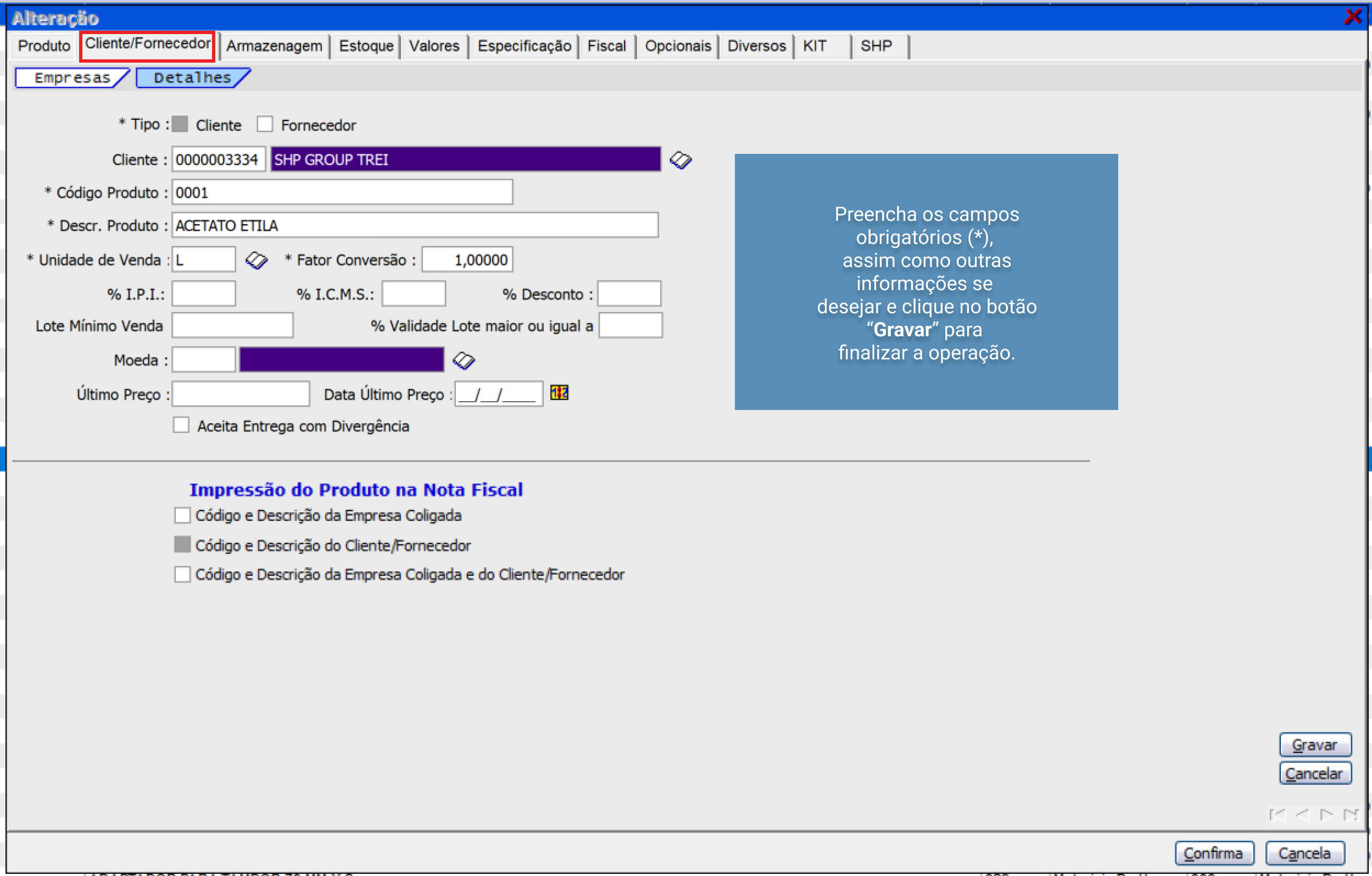 Na aba seguinte, "Cliente/Fornecedor"