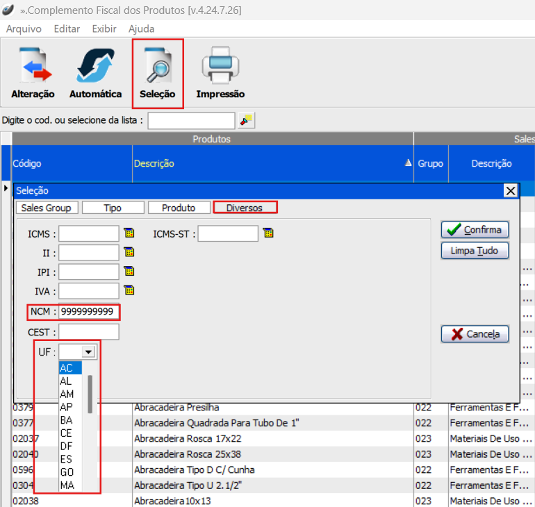 Ao entrar no programa precisa fazer a "Seleção" do que deseja alterar, da seguinte forma: