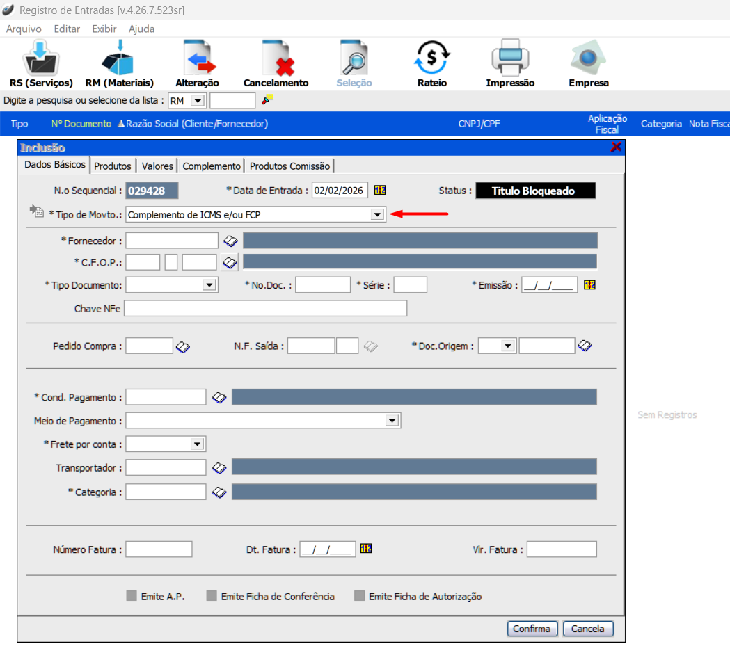Tipo Movimento | Complemento de ICMS e/ou FCP |