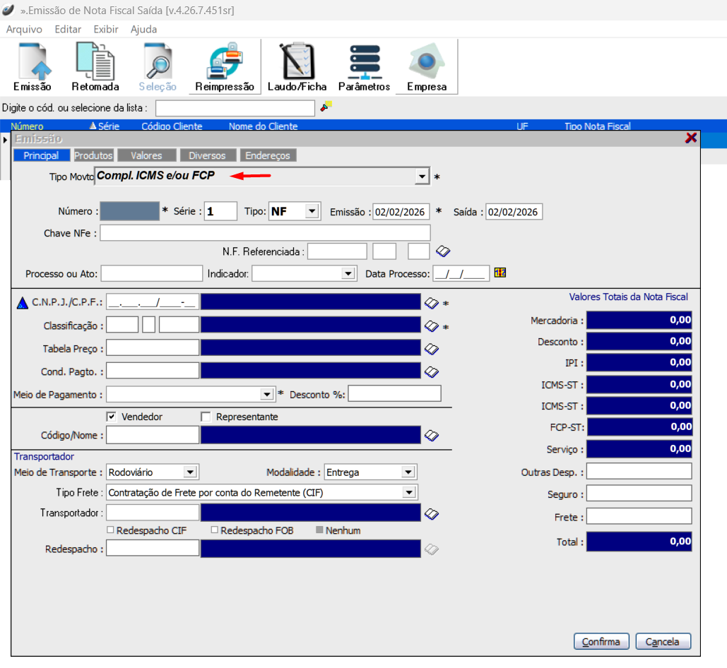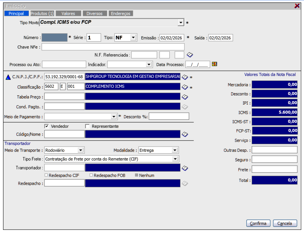 Após ter cadastrado o produto, seguindo as orientações acima podemos emitir a NF-e de Complemento ICMS: