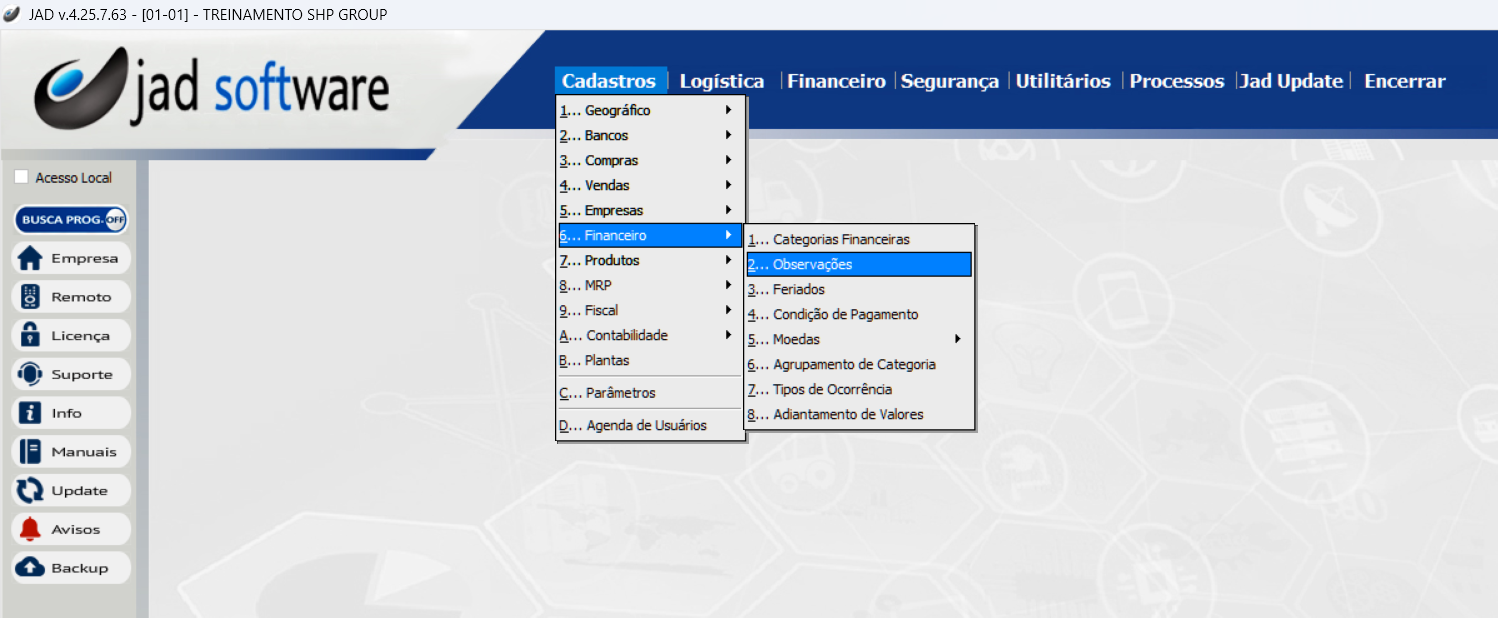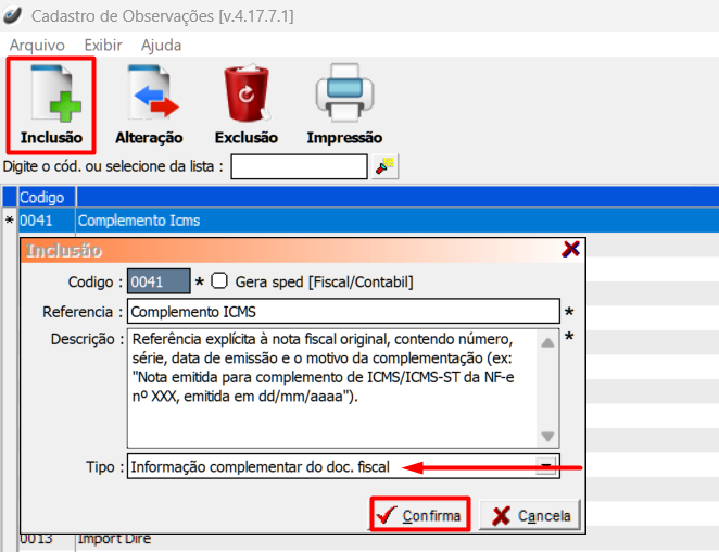 Ao clicar no botão "Incluir" para criar uma nova observação, precisa informar a "Referência", a "Descrição" (O texto que será exibido) e o tipo (Se o texto será apresentado na informação complementar da DANFE).