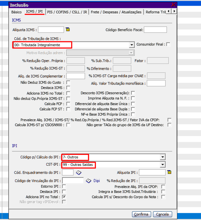 Inicialmente por padrão, essas duas abas "Básico e ICMS/IPI" deverão estar parametrizadas dessa forma.