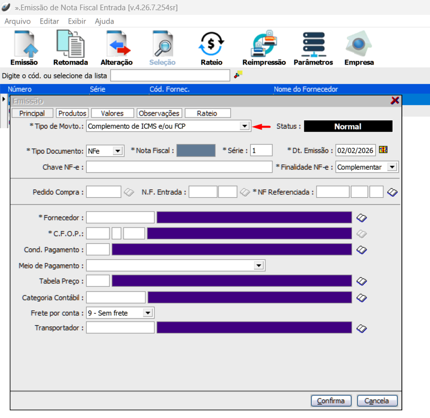 A entrada de Nota Fiscal Complementar do Fornecedor que deveria ter sido tributada na origem e não foi, neste caso quando o fornecedor envia a Nota Fiscal Complementa se utiliza o PCP0102.exe Registro de Entradas com o tipo movimento Complemento de ICMS