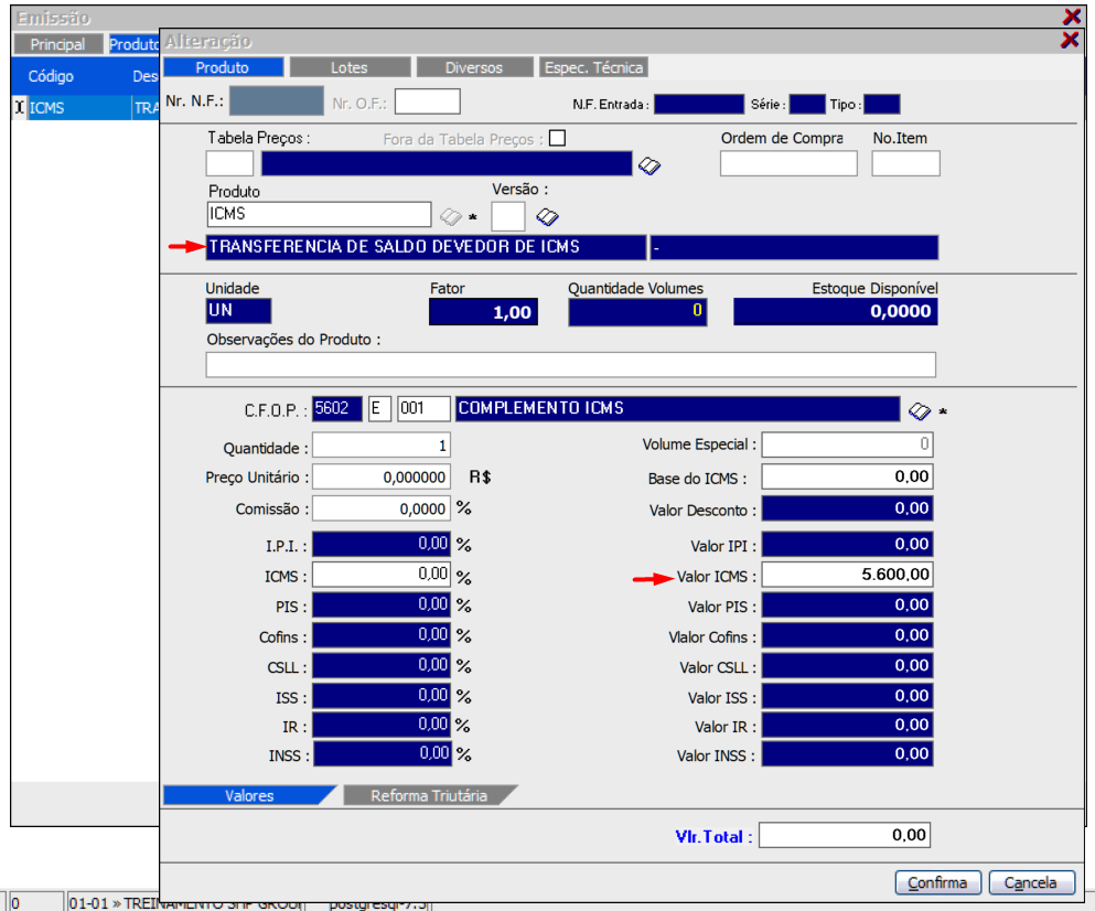 Neste exemplo escolhemos o produto transferência de saldo devedor de ICMS, o campo valor aparece habilitado é para ser preenchido, digitamos o valor do ICMS que será transferido de um estabelecimento para o outro.