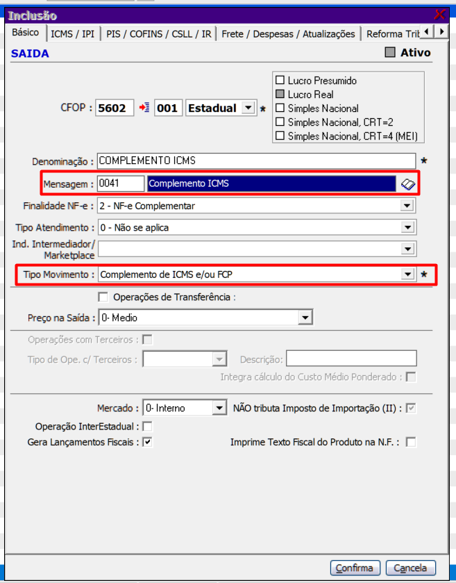 Esta CFOP tem que ser configurada com o tipo interno de Complemento de ICMS.