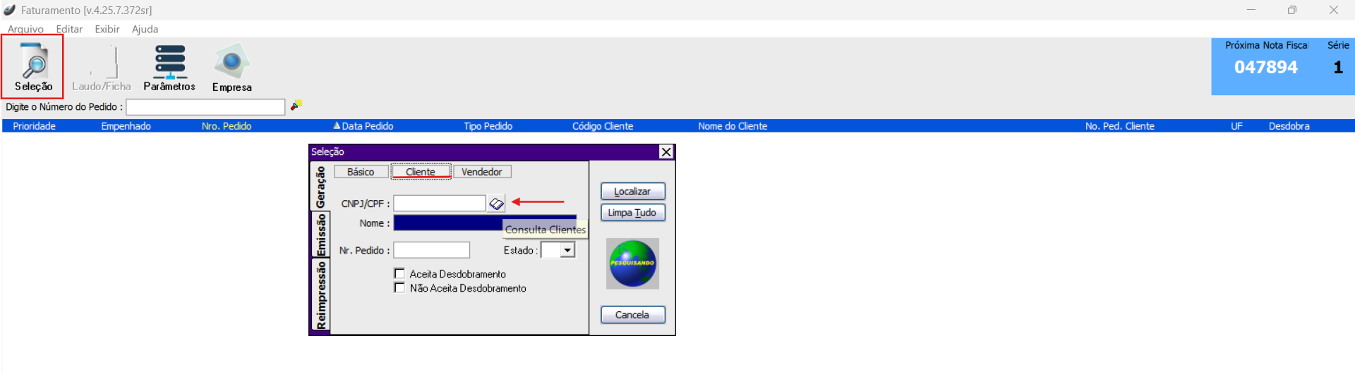 Cliente" para buscar as notas pelo cliente: