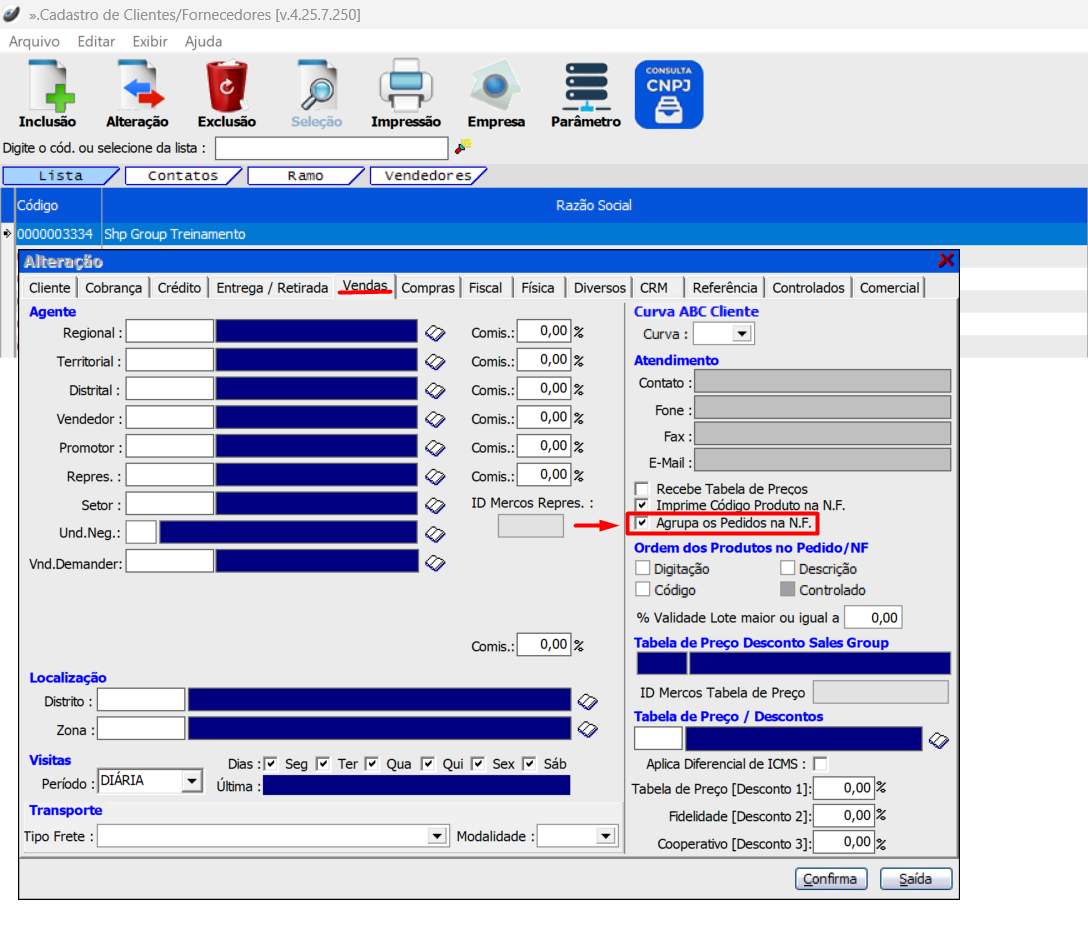 Agrupa os pedidos na NF" acionada a flag, indica que este cliente aceita fundir diversos pedidos em uma única nota fiscal.