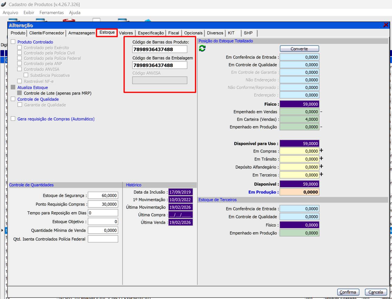 Ao localizar o produto, com um duplo clique localize a aba "Estoque": Note os campos abaixo em destaque: "Código de Barras do Produto" e "Código de Barras da Embalagem"