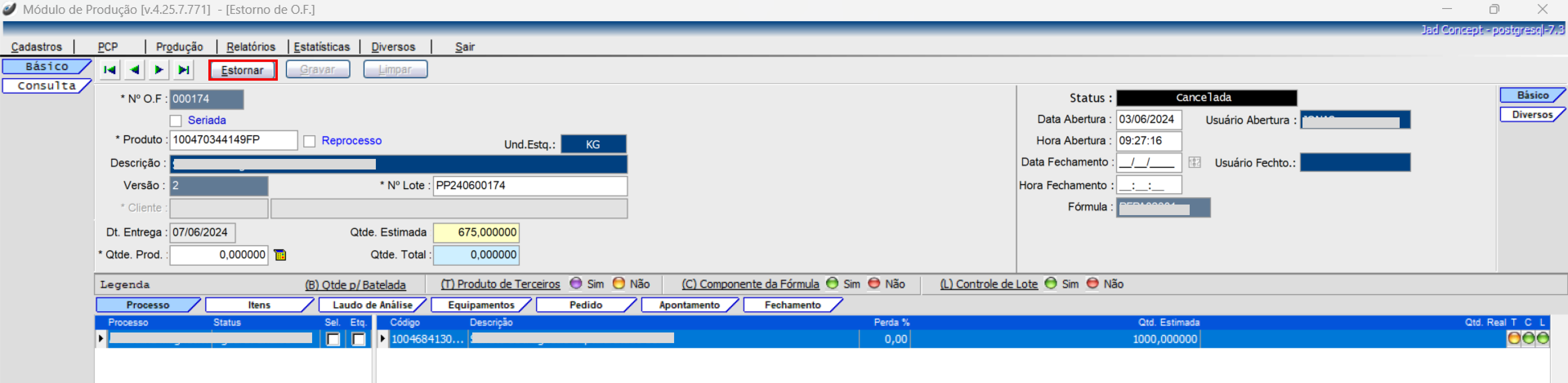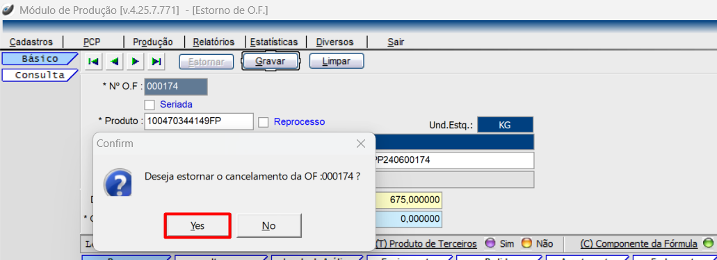 Produção > Estorno de O.F