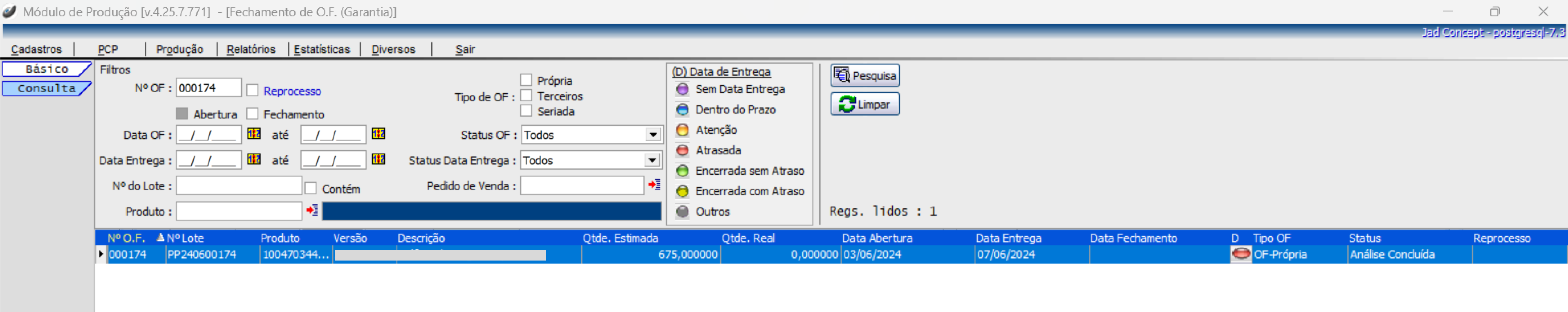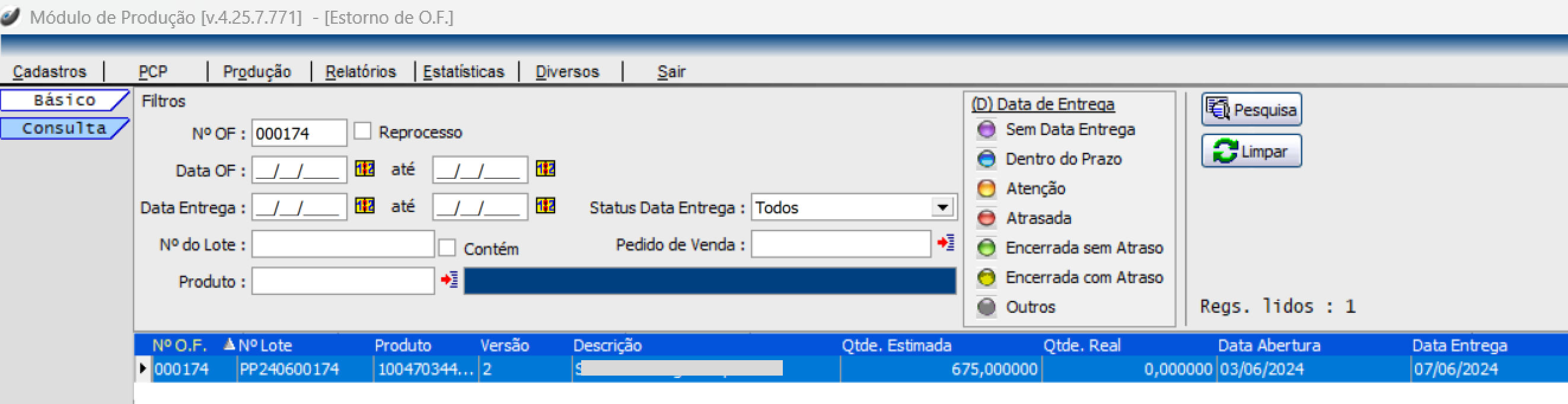 No módulo de Estorno de OF, localize a Ordem de Fabricação com status: