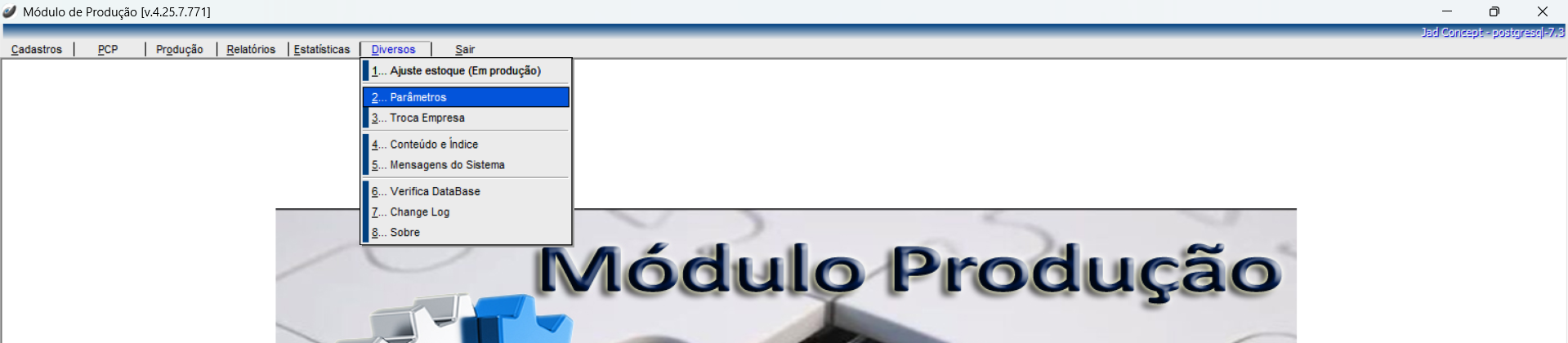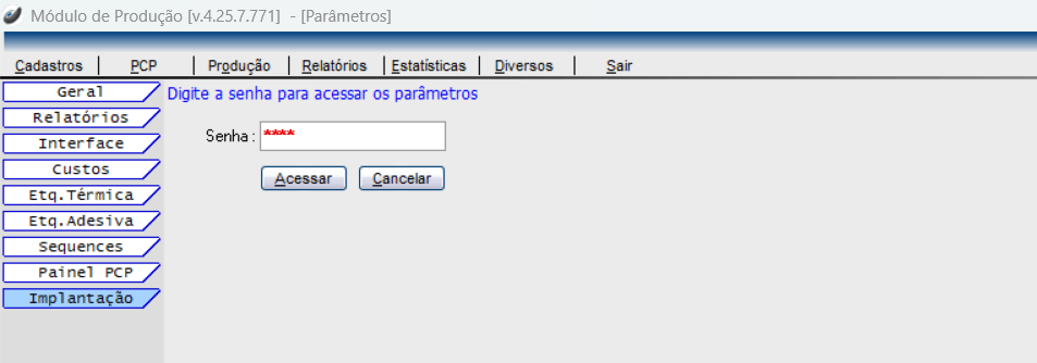 Após acessar os Parâmetros de Modulo de Produção na ficha Implantação habilitar o comando: