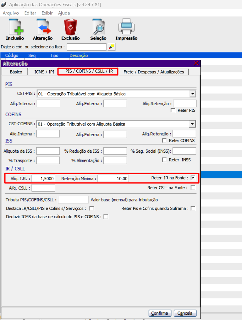 Localize a CFOP e com um duplo clique, na ficha Pis/Cofins/CSLL e IR, clicar no campo reter IR