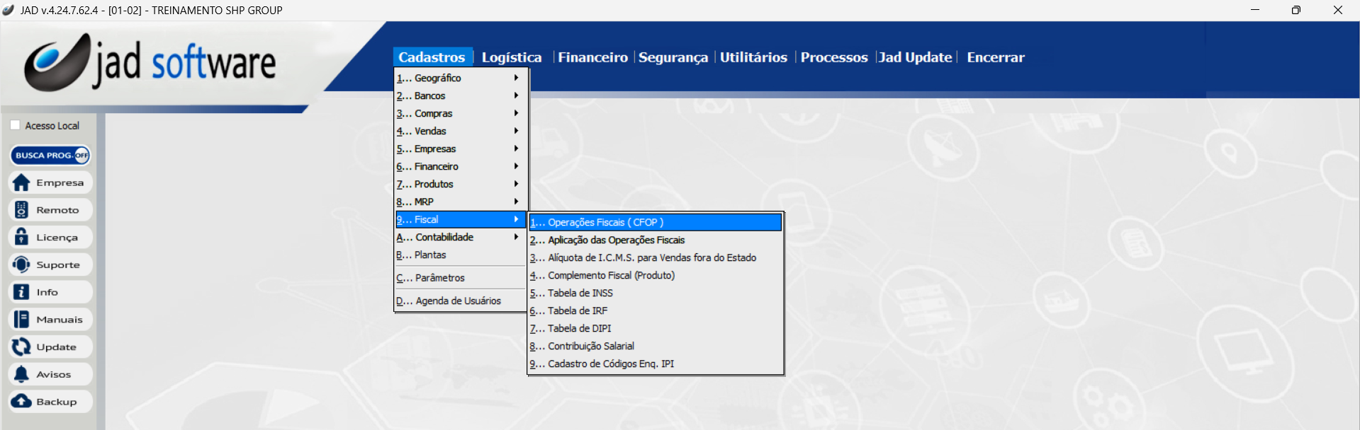 Primeiramente no módulo de Cadastros de Operação Fiscal, para parametrizar a CFOP. Na seguinte rota: