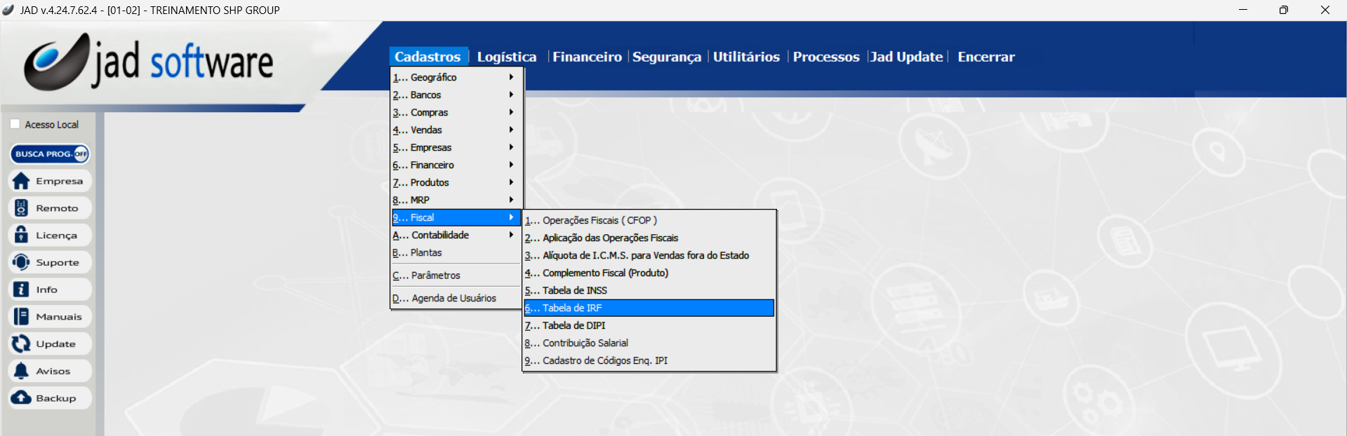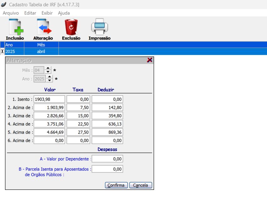 Cadastros > Fiscal > Tabela de IRF
