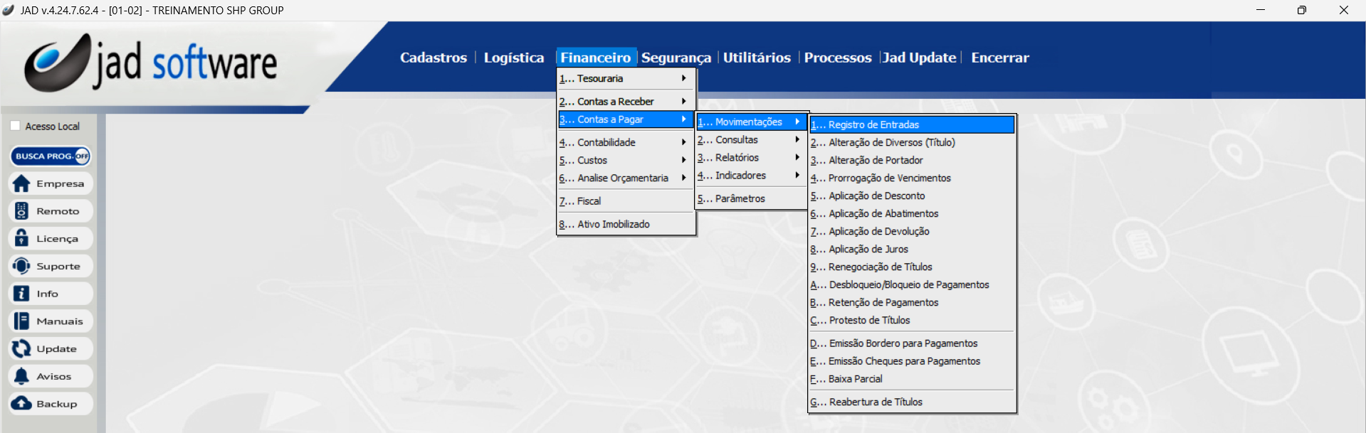 Financeiro > Contas a Pagar > Movimentações > Registro de Entradas