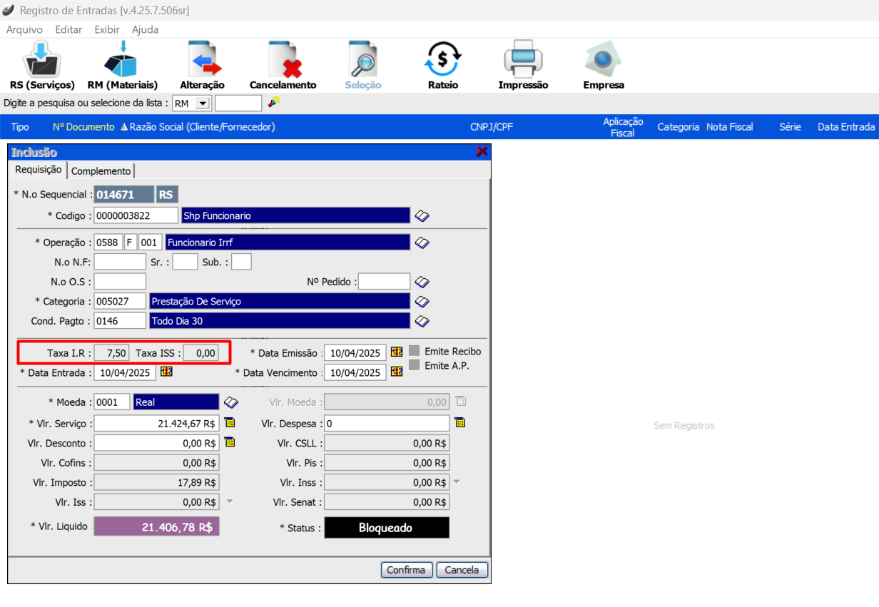 Após preencher os campos, e inserir o valor do serviço, o sistema irá calcular automaticamente com base na tabela de IR.