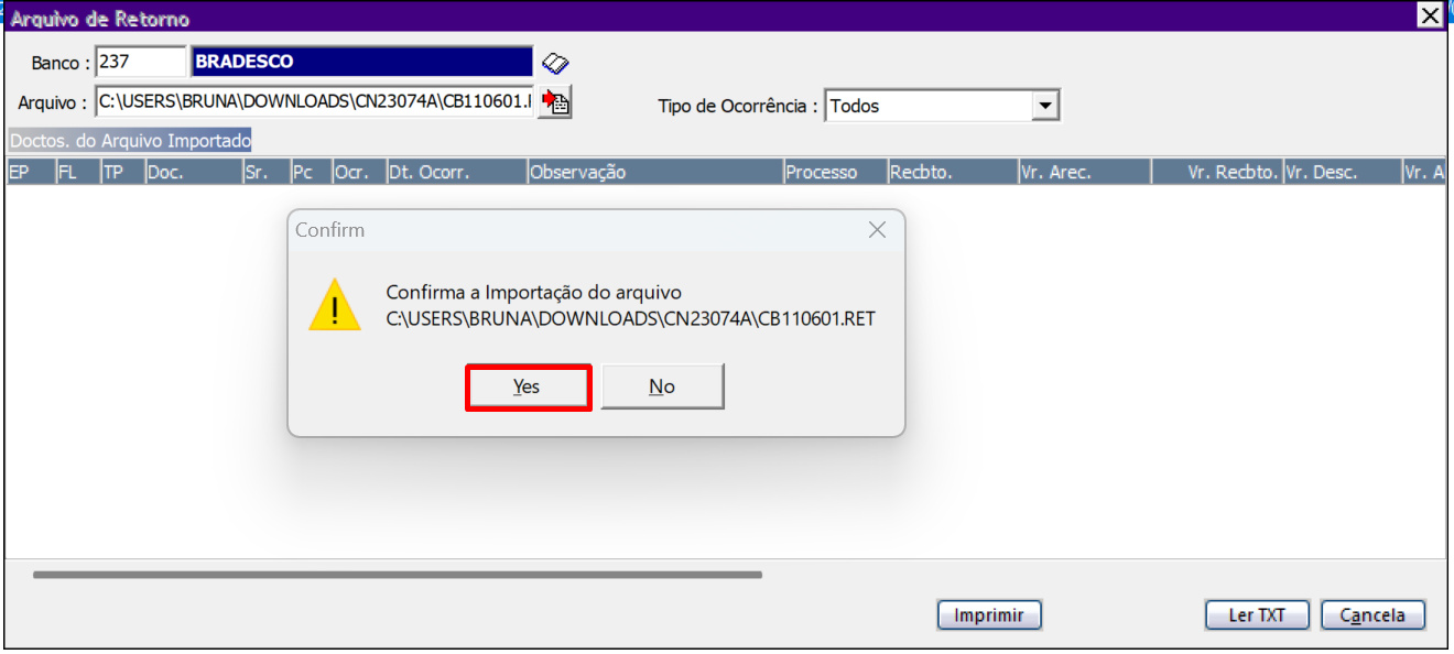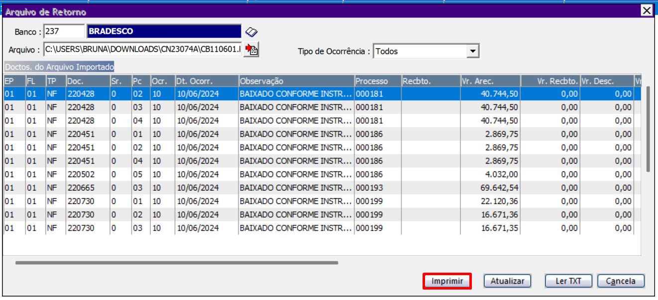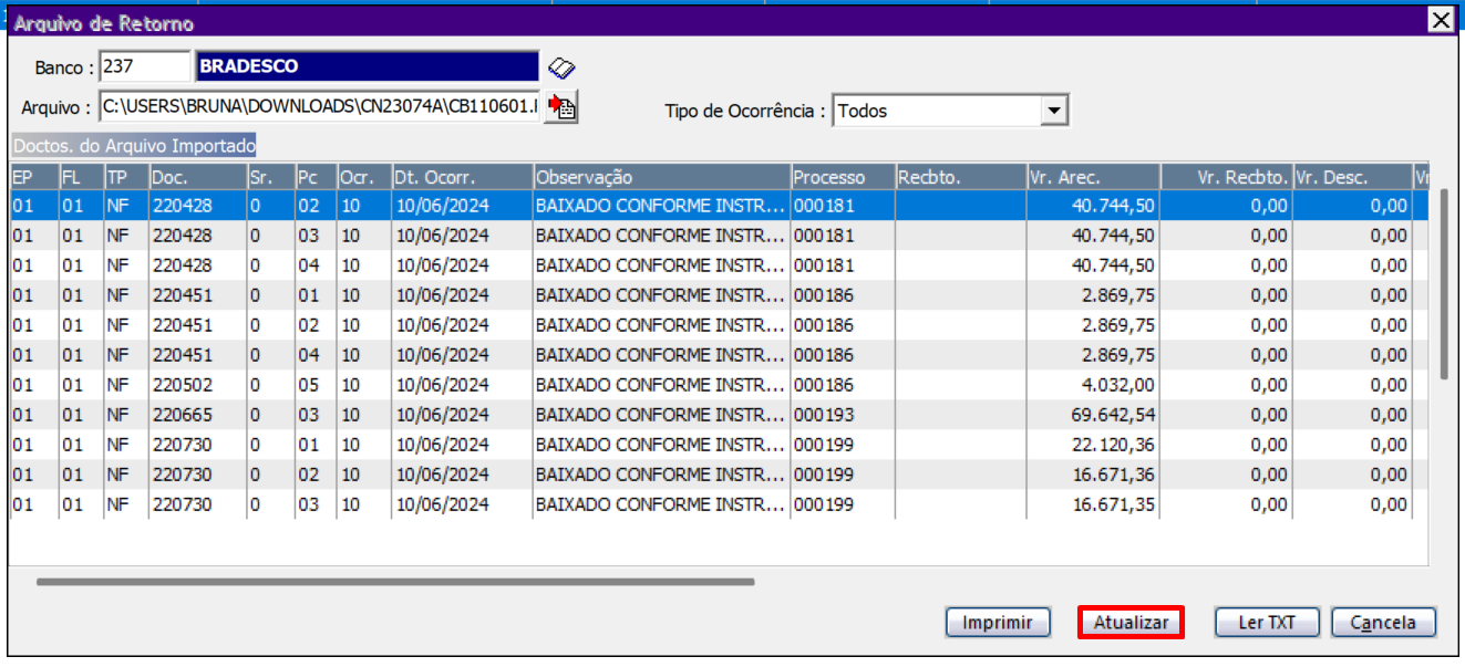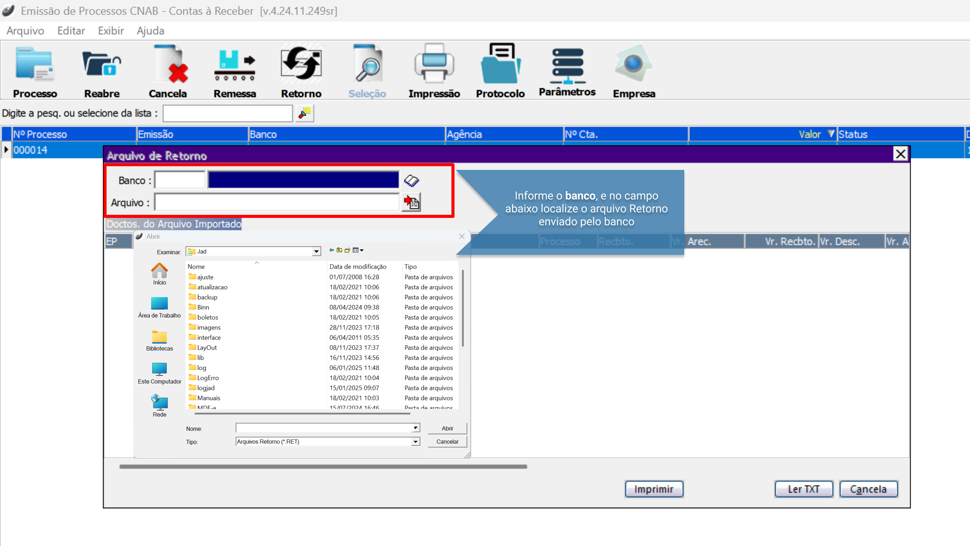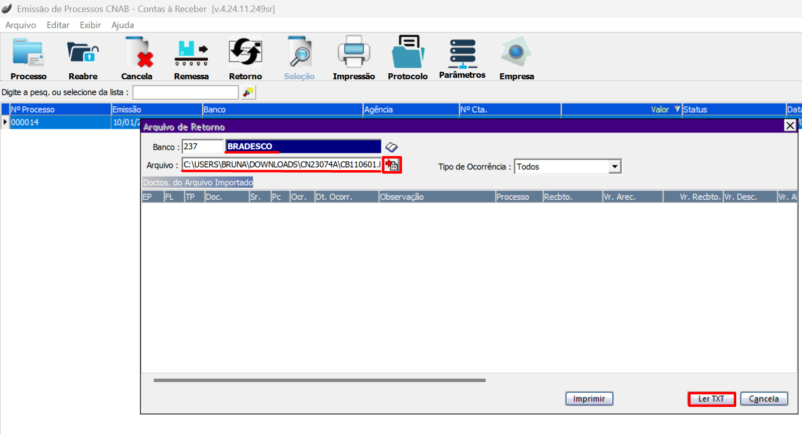 Neste exemplo, usamos o Banco Bradesco, e com um duplo clique selecionamos o arquivo retorno, observe o caminho indicado no campo "Arquivo"