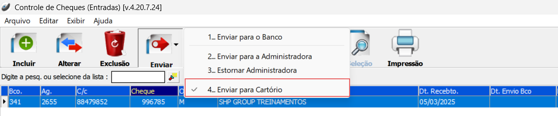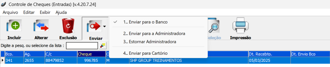 Controle de Cheques (Entradas), tem a função de controlar todos cheques que foram utilizados para dar baixa nos títulos a receber. Contudo existem as opções para controle de status como: Envio para Banco, Envio para Administradora, Estornar Administradora, Envio para Cartório e disponibilização do cheque.